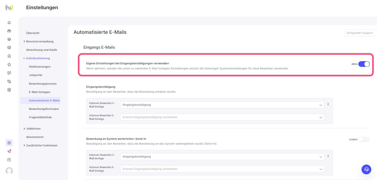 Manche E-Mails, wie zum Beispiel die Eingangsbestätigung der Bewerbung, werden automatisiert aus dem System verschickt und sind unter „Automatisierte E-Mails“ anpassbar.