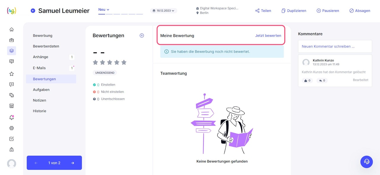 Um Bewerber für die Bearbeitung einfacher zu kategorisieren, haben Sie in der Bewerbermappe die Option diese zu bewerten.