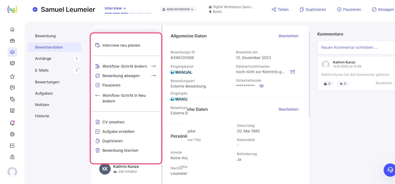 Bewerber im Status „Pausiert“ bleiben weiterhin im Workflow sichtbar, sind aber nicht mehr aktiv im Bewerbungsprozess. Neben der Option den Bewerber wieder auf den vorherigen aktiven Status zu setzen, gibt es noch die Sofortabsage oder den Absagekorb.