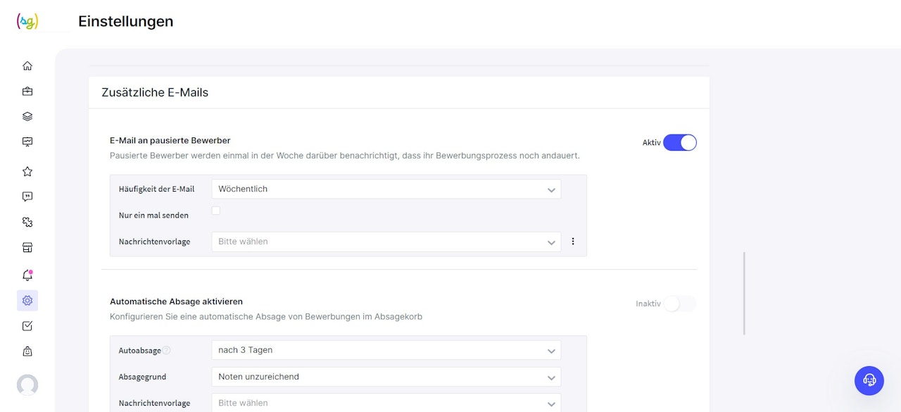 Werden Bewerber pausiert, befinden sie sich im Status „Pausiert“. Dabei erfolgen automatisierte Benachrichtigungen an die Bewerber, dass sich die Bearbeitung noch etwas verzögert. Den Zeitraum und Häufigkeit des Zwischenbescheids, sowie die gewünschte E-Mail Vorlage lassen sich in den Einstellungen unter Automatisierte E-Mails festlegen.
