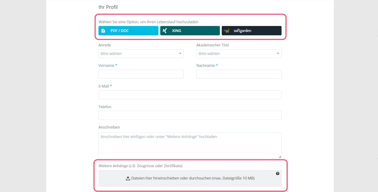 Im Anschluss wählt er eine der Optionen, um seinen Lebenslauf hochzuladen. Dies kann durch „PDF/DOC“ und einem Daten-Import aus Xing bzw. dem Profil im softgarden Network erfolgen. Weitere Anhänge, wie bspw. Zeugnisse und Zertifikate, können über „Weitere Anhänge“ der Bewerbung hinzugefügt werden.