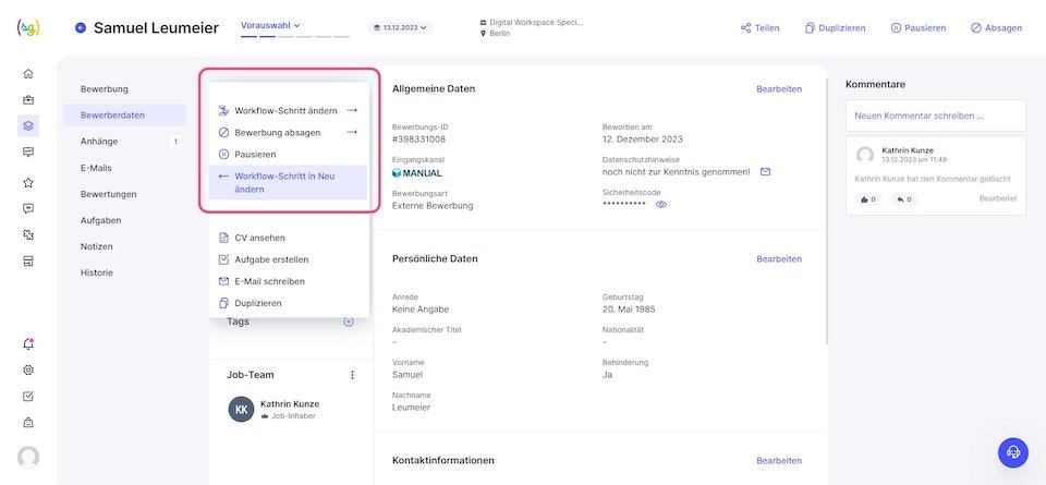 Administratoren können ab dem Schritt Vorauswahl, Bewerber zurück in den Status 'Neu' verschieben. Klicken Sie dazu auf den Menüpunkt „Workflow-Schritt in Neu ändern“.