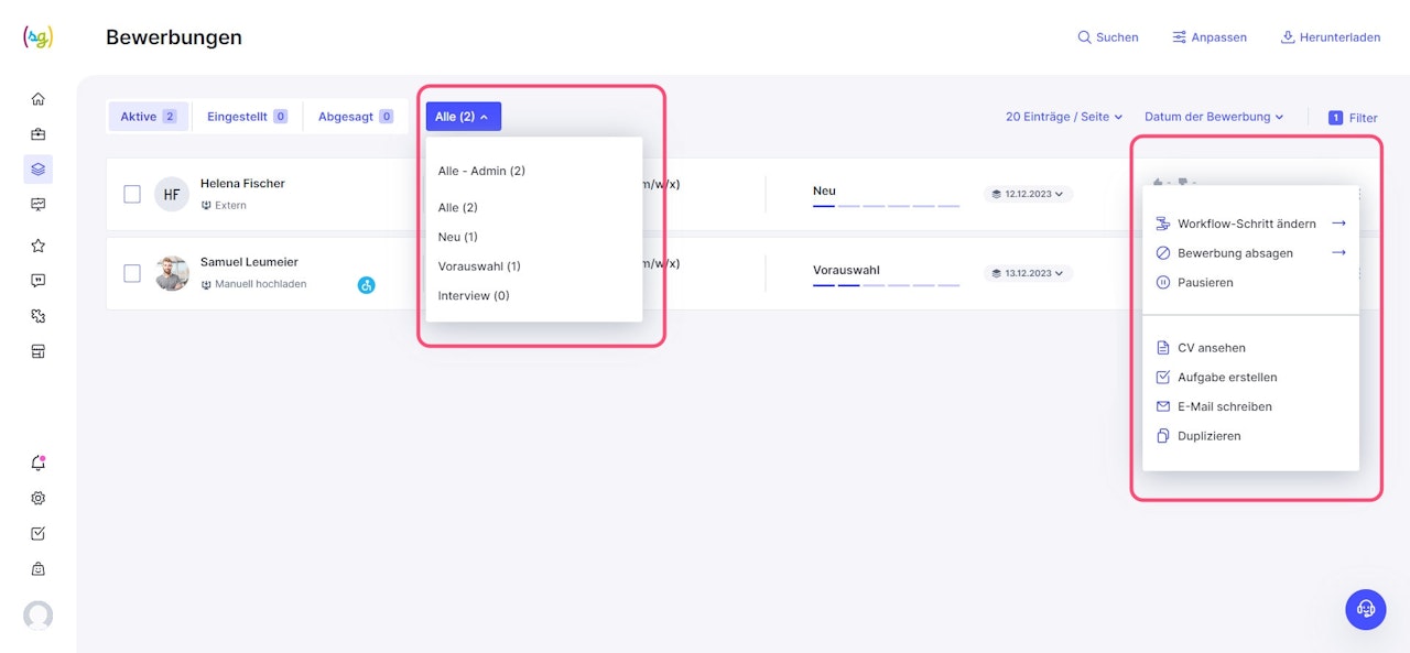 In der Bewerberübersicht erhalten Sie neben Informationen zum aktuellen Status der Bewerber auch die verschiedenen Optionen darauf zu reagieren und im blauen Feld den Status zu ändern. In der Jobansicht unter „Bewerbungen“ ist ersichtlich, wie viele Bewerber sich auf welchem Workflow-Schritt befinden.