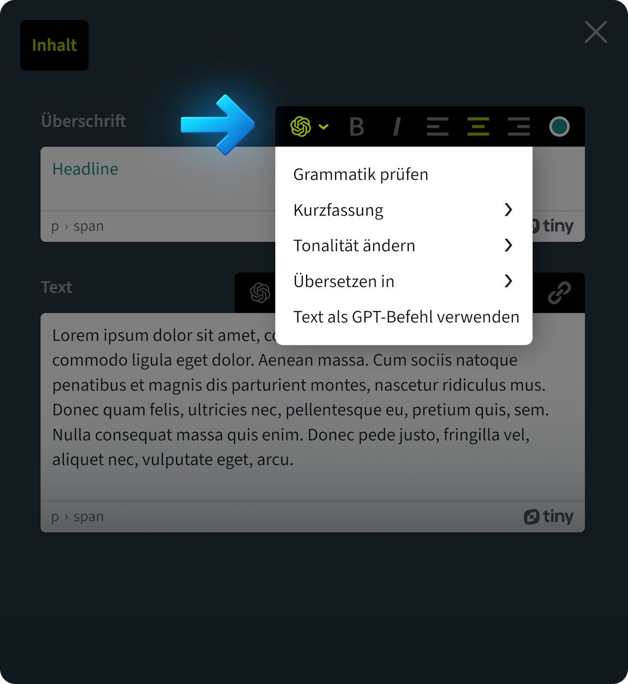 Die Integration von ChatGPT ist nun in jeder Komponente Ihrer Karriereseite verfügbar und bietet Ihnen vielfältige Optionen zur Verbesserung und Übersetzung Ihrer Texte.