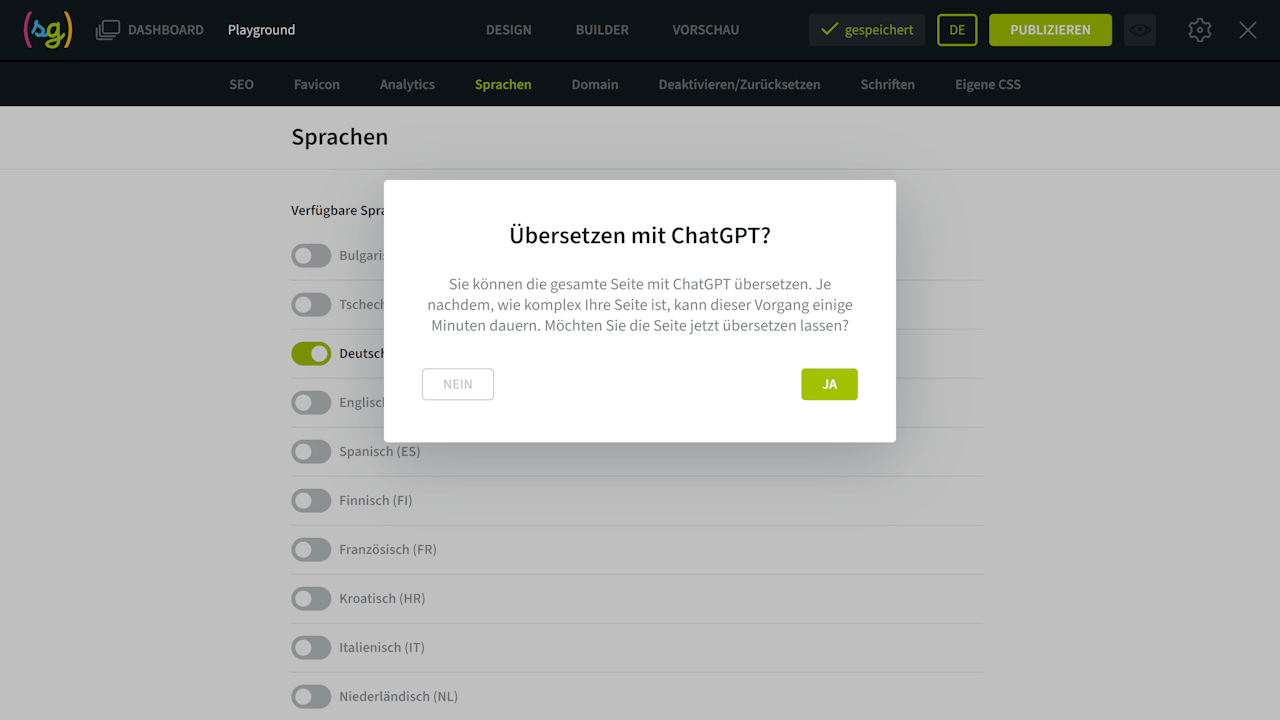 Mit dem neuen Release 31 fragt das System, ob Sie Ihre Seite mit ChatGPT übersetzen wollen. Bestätigen Sie diese Abfrage.