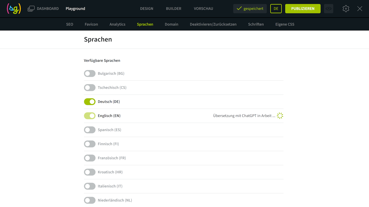 Die Seite wird nun übersetzt. Je nach Komplexität Ihrer Karriereseite kann dieser Vorgang bis zu 5 Minuten dauern. Aber keine Sorge, Sie können während dieser Zeit weiterarbeiten. Sobald die Übersetzung abgeschlossen ist, wird die übersetzte Seite im Sprachauswahlmenü neben dem Button Veröffentlichen verfügbar sein.