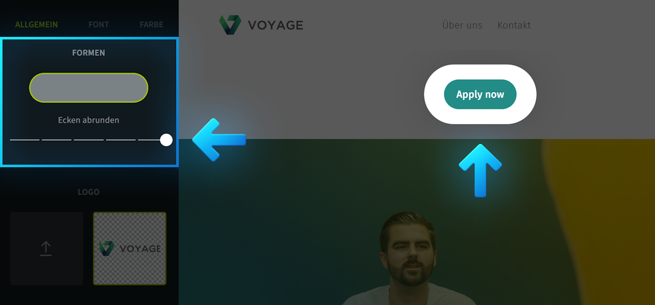 Standardmäßig ist die Mehrzahl der grafischen Elemente wie Buttons oder Kacheln eckig. Wenn Ihr Design jedoch abgerundete Ecken vorsieht, bieten die Design-Einstellungen 6 Abrundungsstufen.