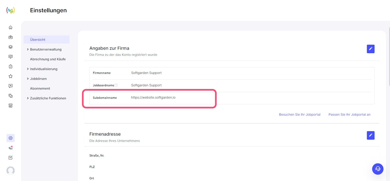 Die dazu benötigte Subdomain Ihres Jobportals finden Sie in den Einstellungen unter „Übersicht“.