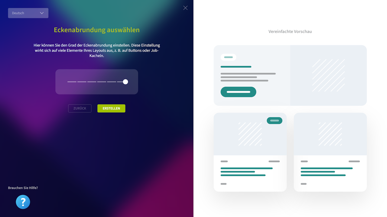 Hier können Sie den Grad der Eckenabrundung einstellen. Diese Einstellung wirkt sich auf viele Elemente Ihres Layouts aus, z. B. auf Buttons oder Job-Kacheln.