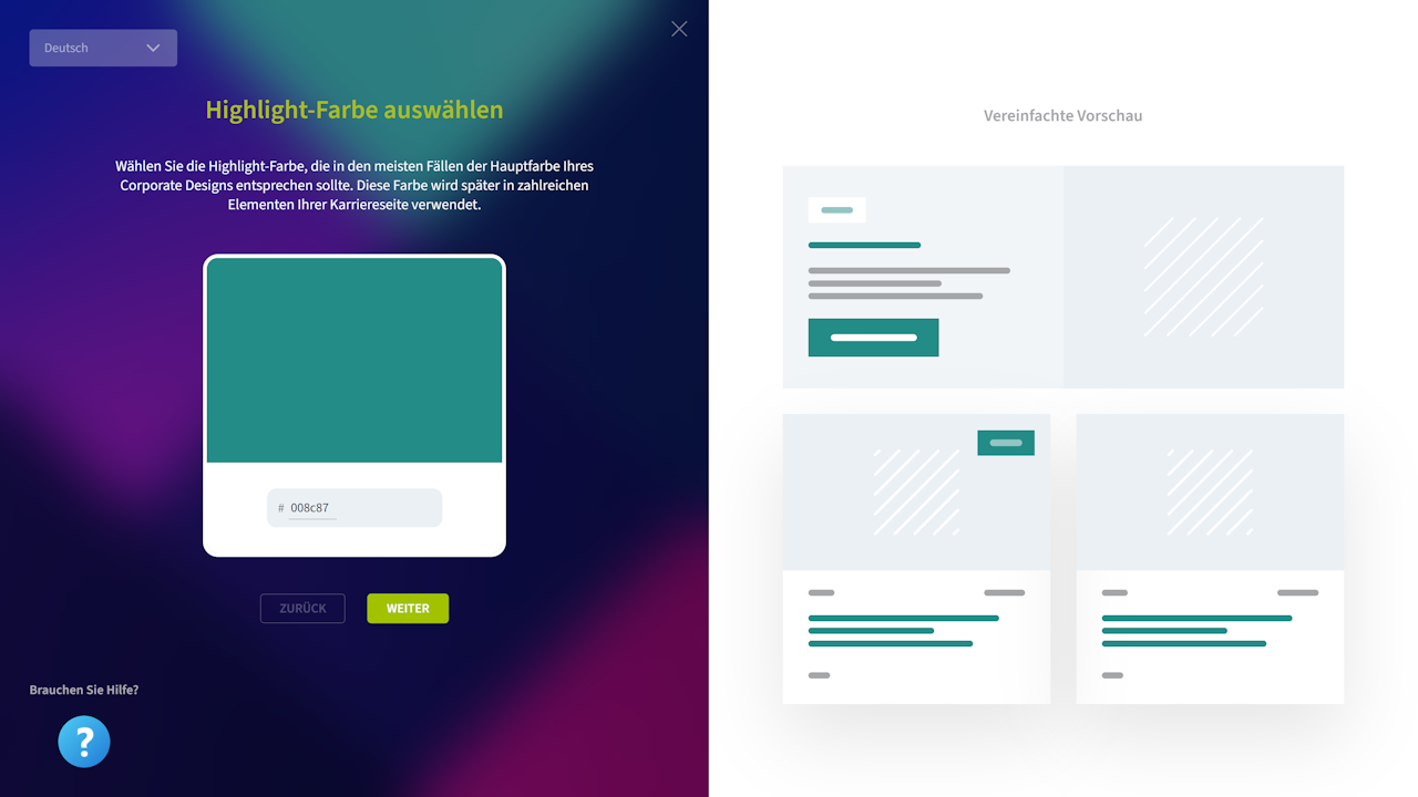 Wählen Sie die Highlight-Farbe, die in den meisten Fällen der Hauptfarbe Ihres Corporate Designs entsprechen sollte. Diese Farbe wird später in zahlreichen Elementen Ihrer Karriereseite verwendet.