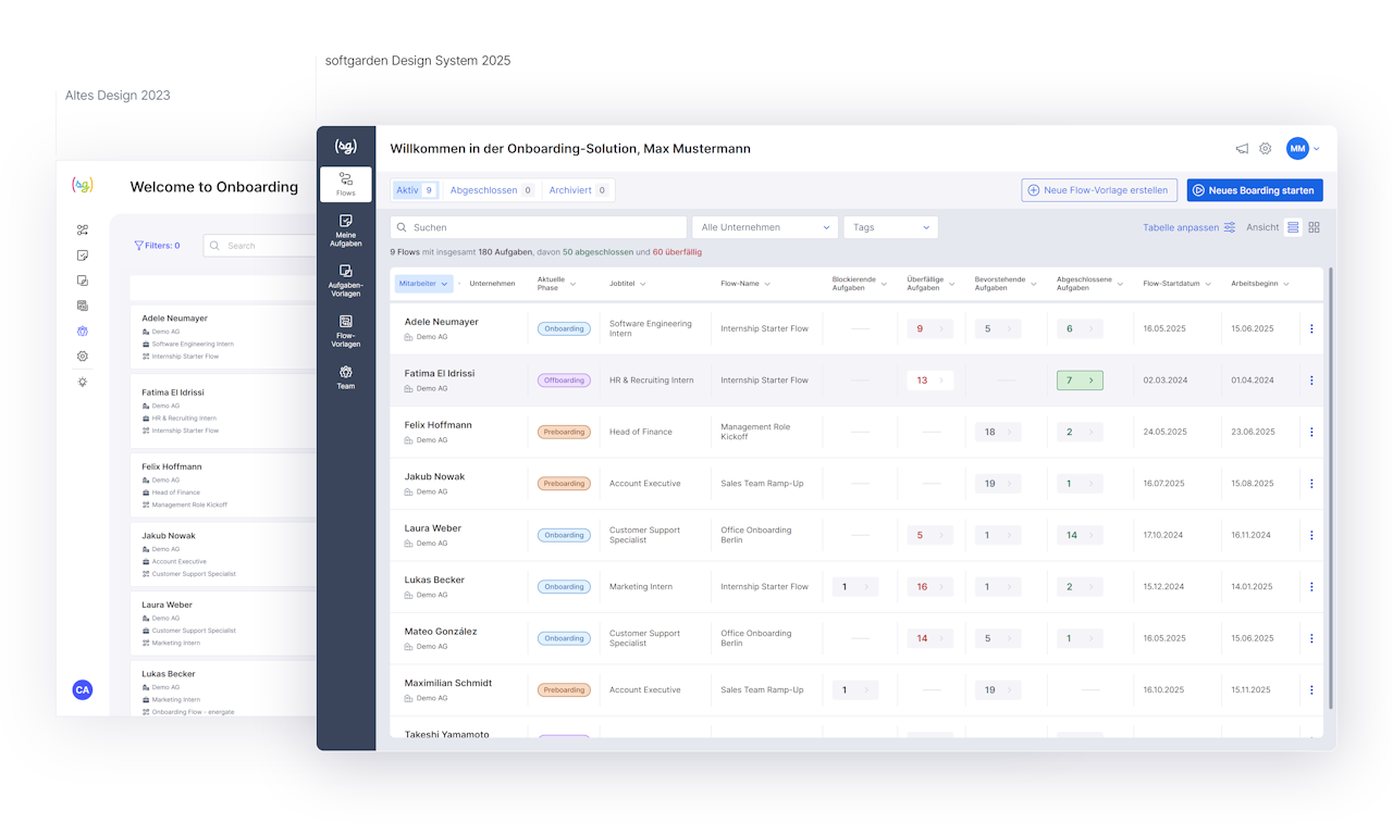 Im Zentrum steht die komplett überarbeitete Flow-Übersichtsseite, der zentrale Einstiegspunkt für die Verwaltung aller Onboardings. Das neue Layout sorgt für ein einheitliches Nutzungserlebnis über alle softgarden-Produkte hinweg, insbesondere für Nutzer, die bereits mit dem Bewerbermanagement vertraut sind.