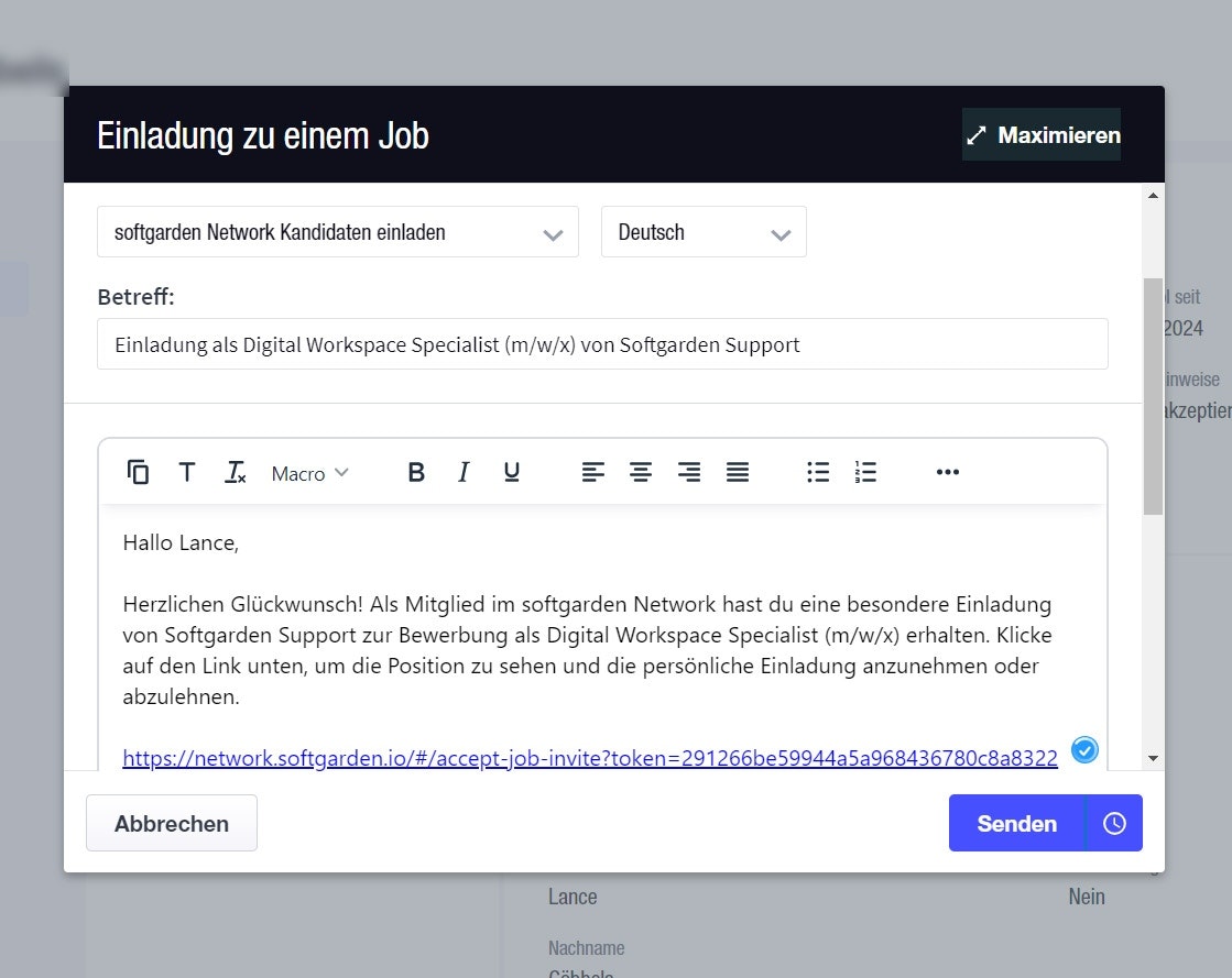 Darauffolgend öffnet sich eine neue Maske, in der alle Ihre Jobs in einem Dropdown-Menü aufgelistet sind. Entsprechend lässt sich die gewünschte Stelle auswählen, bevor die Einladung per E-Mail versendet wird.