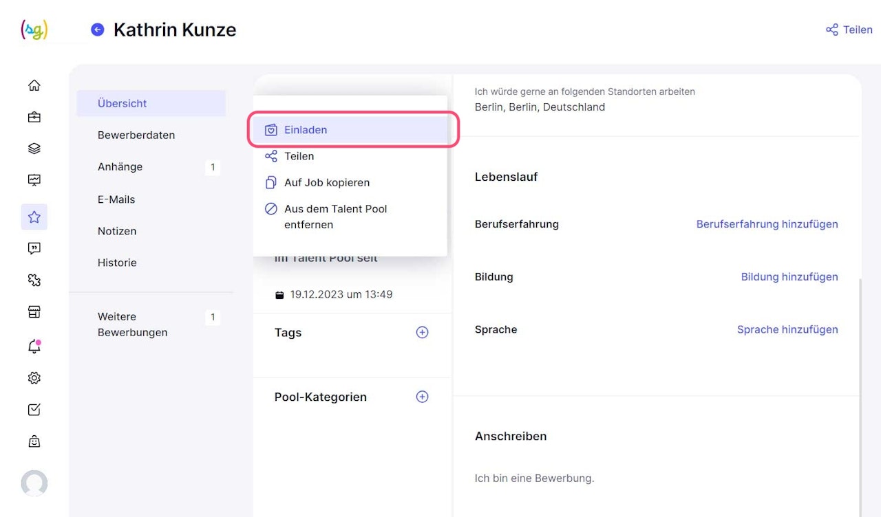 Kandidaten im Talent Pool zu einem Job einladen