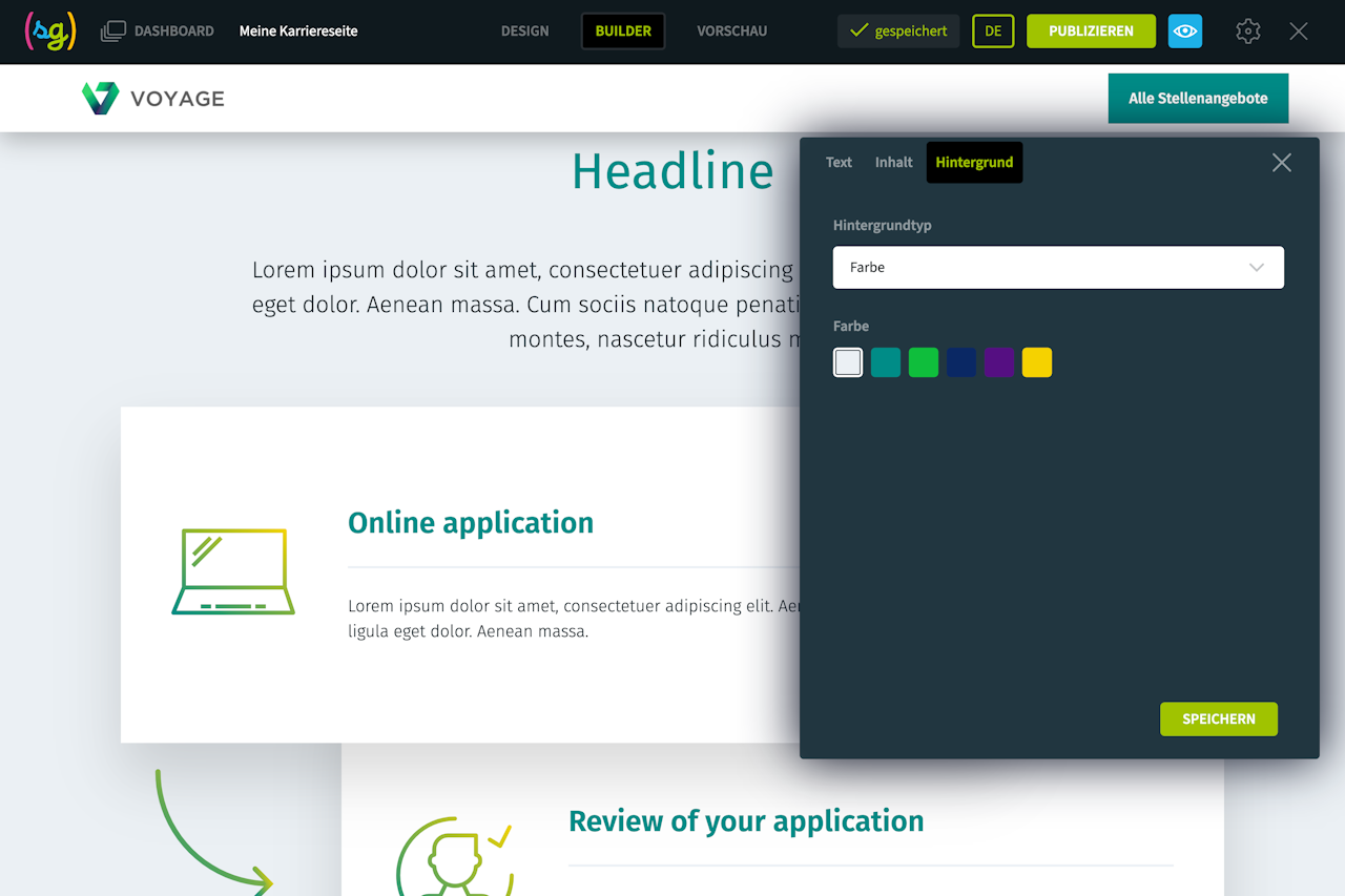 Ein diagonaler Farbverlauf, um dem Hintergrundbild einen visuellen Impuls zu geben. Am besten ist es, hier zwei Unternehmensfarben zu verwenden. Sie können die Transparenz des Farbverlaufs mit einem Schieberegler einstellen.