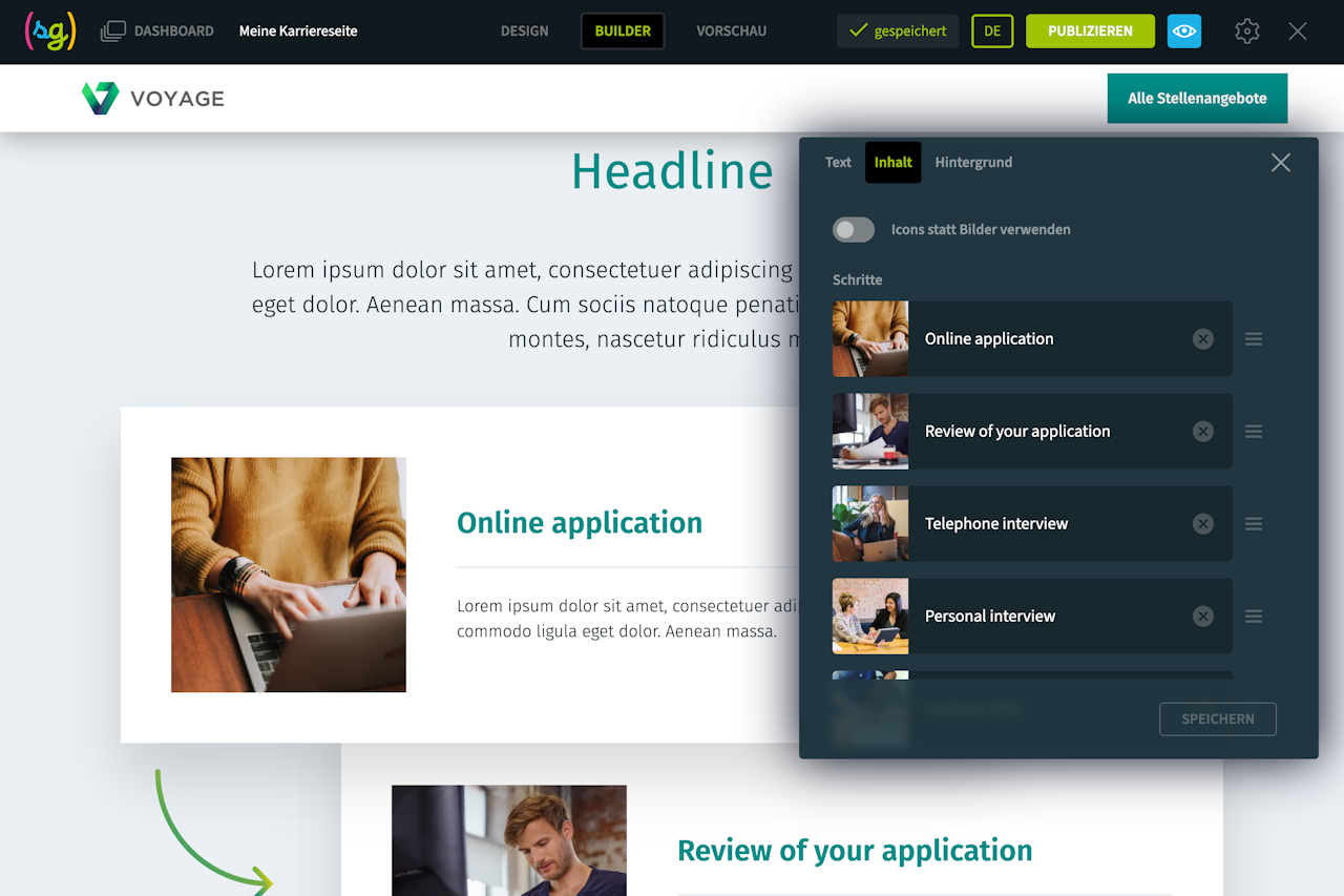 Die Standardkonfiguration dieser Komponente ist bereits passend zum Thema vorausgefüllt. Sie können jedoch den gesamten Inhalt selbst definieren und eine beliebige Anzahl von Schritten einfügen. Ändern Sie den Inhalt der vorkonfigurierten Schritte oder löschen Sie alle Einträge und fügen Sie neue Schritte ein.
