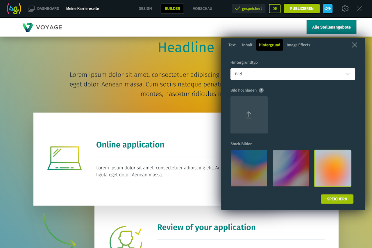 Ein diagonaler Farbverlauf, um dem Hintergrundbild einen visuellen Impuls zu geben. Am besten ist es, hier zwei Unternehmensfarben zu verwenden. Sie können die Transparenz des Farbverlaufs mit einem Schieberegler einstellen.