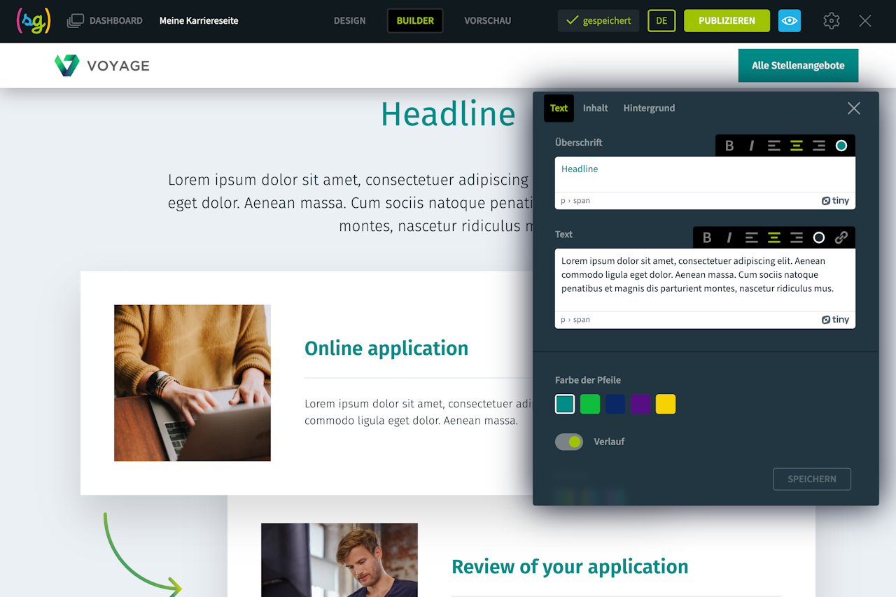 Farben: Sie können dem gesamten Text oder einzelnen Wörtern eine beliebige Farbe zuweisen. Die Farben werden im Tab „Design“ definiert. Markieren Sie zunächst den Text und klicken Sie dann auf das Kreissymbol mit der Farbe, um den Text einzufärben.