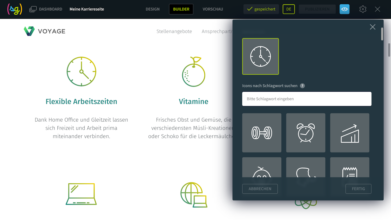 In der Komponente sind bereits über 100 Icons hinterlegt, die den typischen Leistungen entsprechen. Scrollen Sie, um ein passendes Icon zu finden, oder benutzen Sie die Suche.