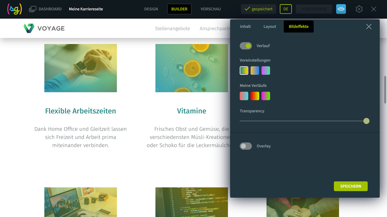 Sie können einen neuen Farbverlauf erstellen, der zu Ihrem Corporate Design passt, und dann diese Option in der Image Box aktivieren.