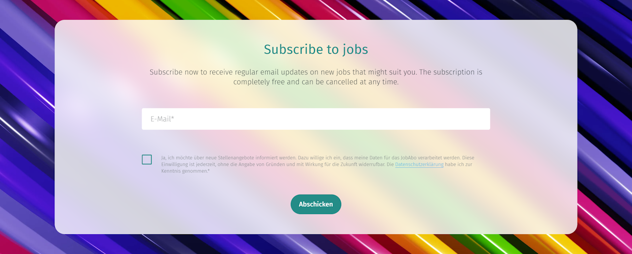 In Release 30 wurde eine neue Komponente hinzugefügt, die es Ihren Interessenten ermöglicht, sich in eine Verteilerliste einzutragen. Sobald eine neue Stelle ausgeschrieben wird und die Jobkategorie und/oder Zielgruppe mit der gewählten Einstellung des Interessenten übereinstimmen, wird diese Person per E-Mail über die neue Stelle informiert.