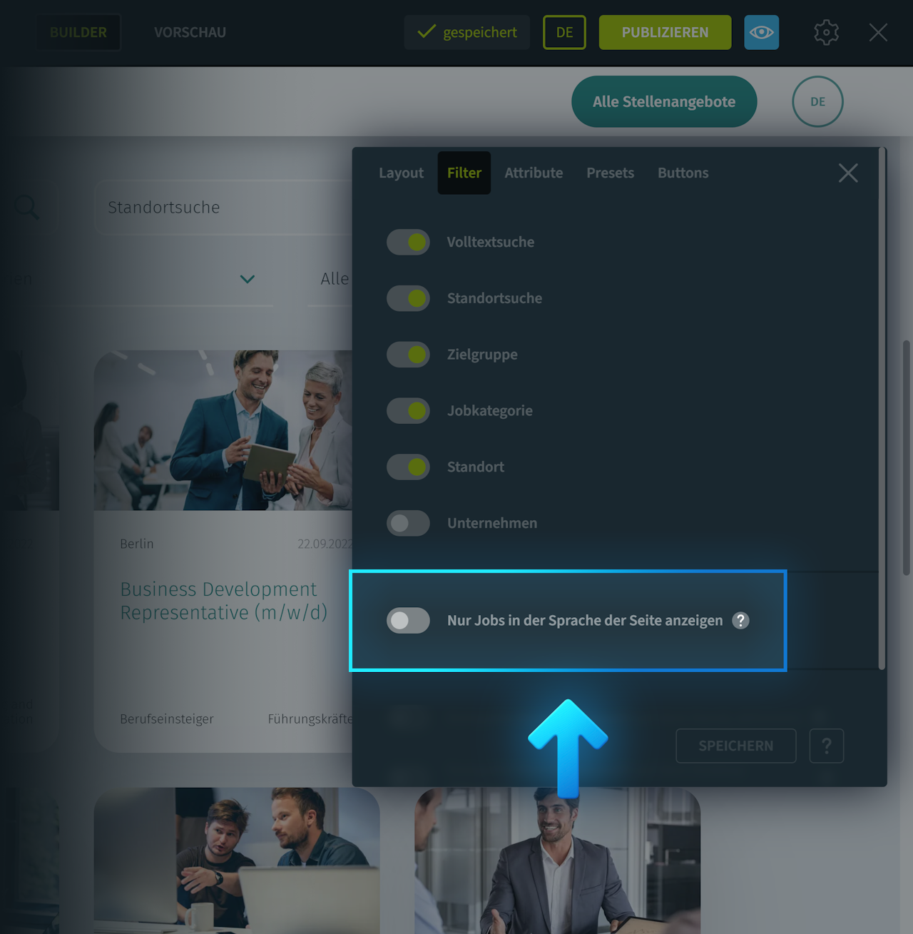 Wechseln Sie nun auf die Karriereseite und aktivieren Sie die neue Filterfunktion sowohl auf Ihrer deutschen als auch auf Ihrer englischen Karriereseite. Nun wird die englische Stelle auf der deutschen Seite ausgeblendet und umgekehrt.