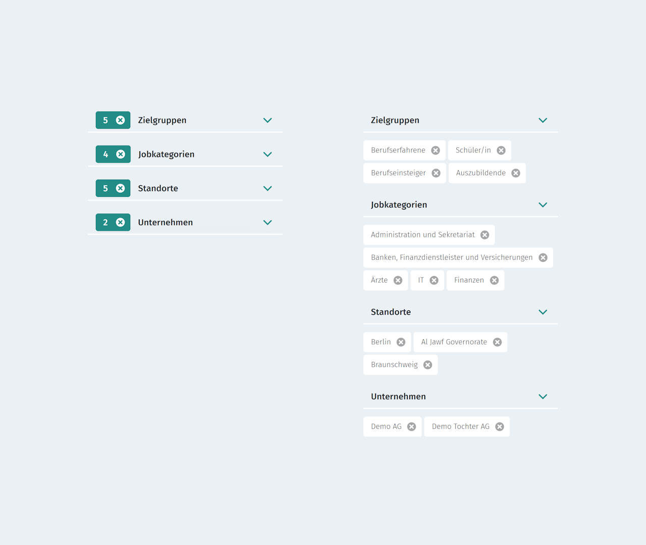 Standardmäßig werden mehrere ausgewählte Filteroptionen unterhalb des Filters angezeigt, was dazu führt, dass der Filterblock sehr wuchtig erscheinen kann, wenn viele Filter mehrfach ausgewählt sind.