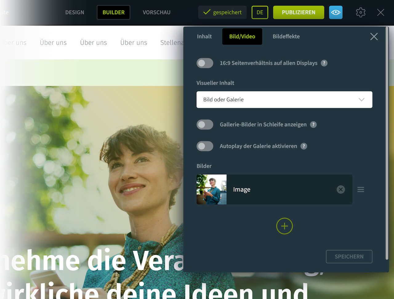 Wenn Sie mehrere Bilder hinzufügen, wird automatisch eine Galerie erstellt. Sie können die Galerie-Bilder in Schleife anzeigen oder automatisch wechseln lassen (Autoplay).