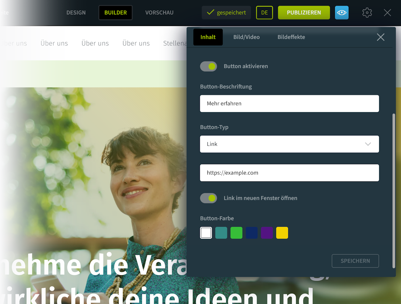 Sie können auch einen Button unterhalb der Headline aktivieren. Folgende Button-Funktionen sind verfügbar: