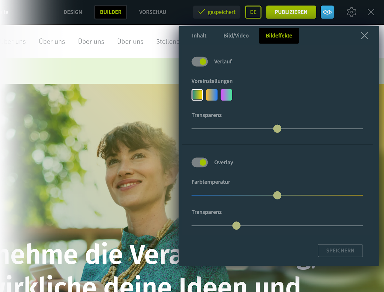 Damit die Überschrift gut lesbar ist, ist es in den meisten Fällen notwendig, die Bildhelligkeit etwas abzudämpfen. Sie können auch die Farbtemperatur des Overlays (kalt ↔ warm) und seine Transparenz einstellen.
