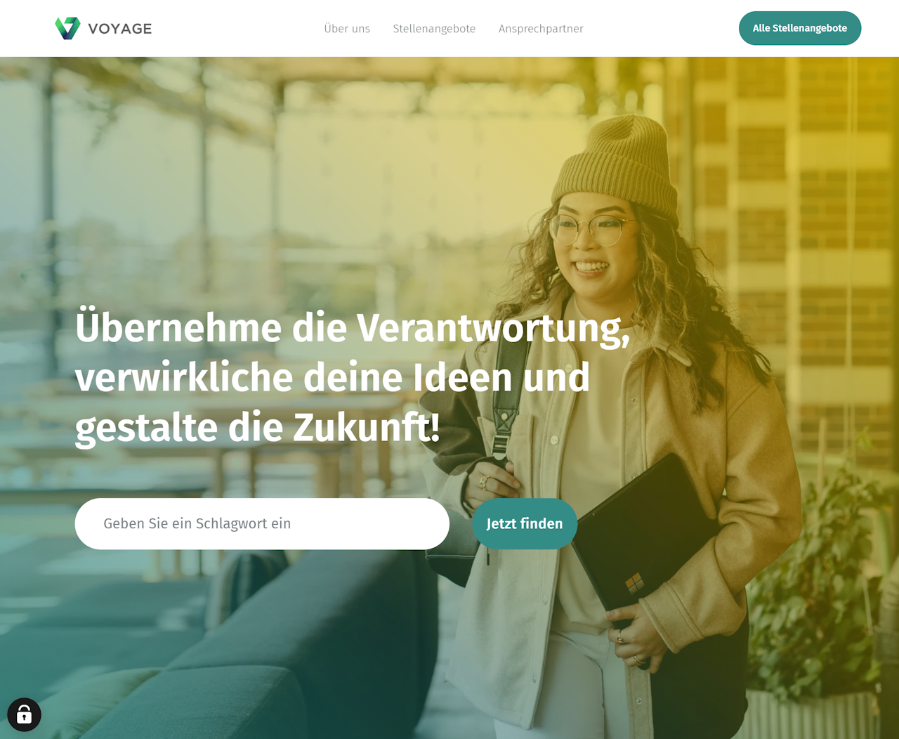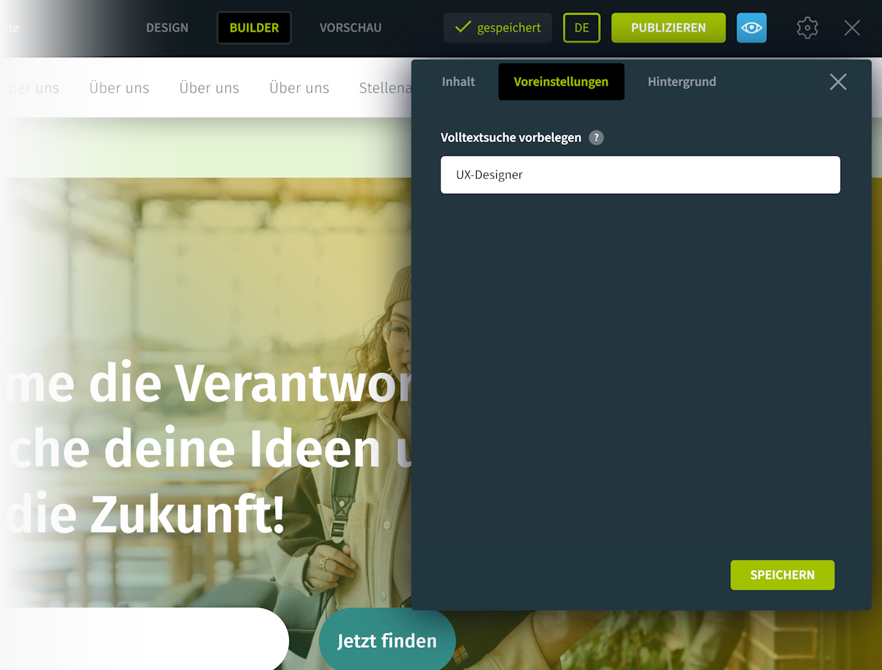 Eine typische Karriereseite zeigt die Jobsuche oft sehr präsent im ersten Viewport. Dieses Konzept können Sie mit dem Keyvisual mit Suche umsetzen. Nach Eingabe des Suchbegriffs wird der Bewerber automatisch zu den Suchergebnissen weitergeleitet.