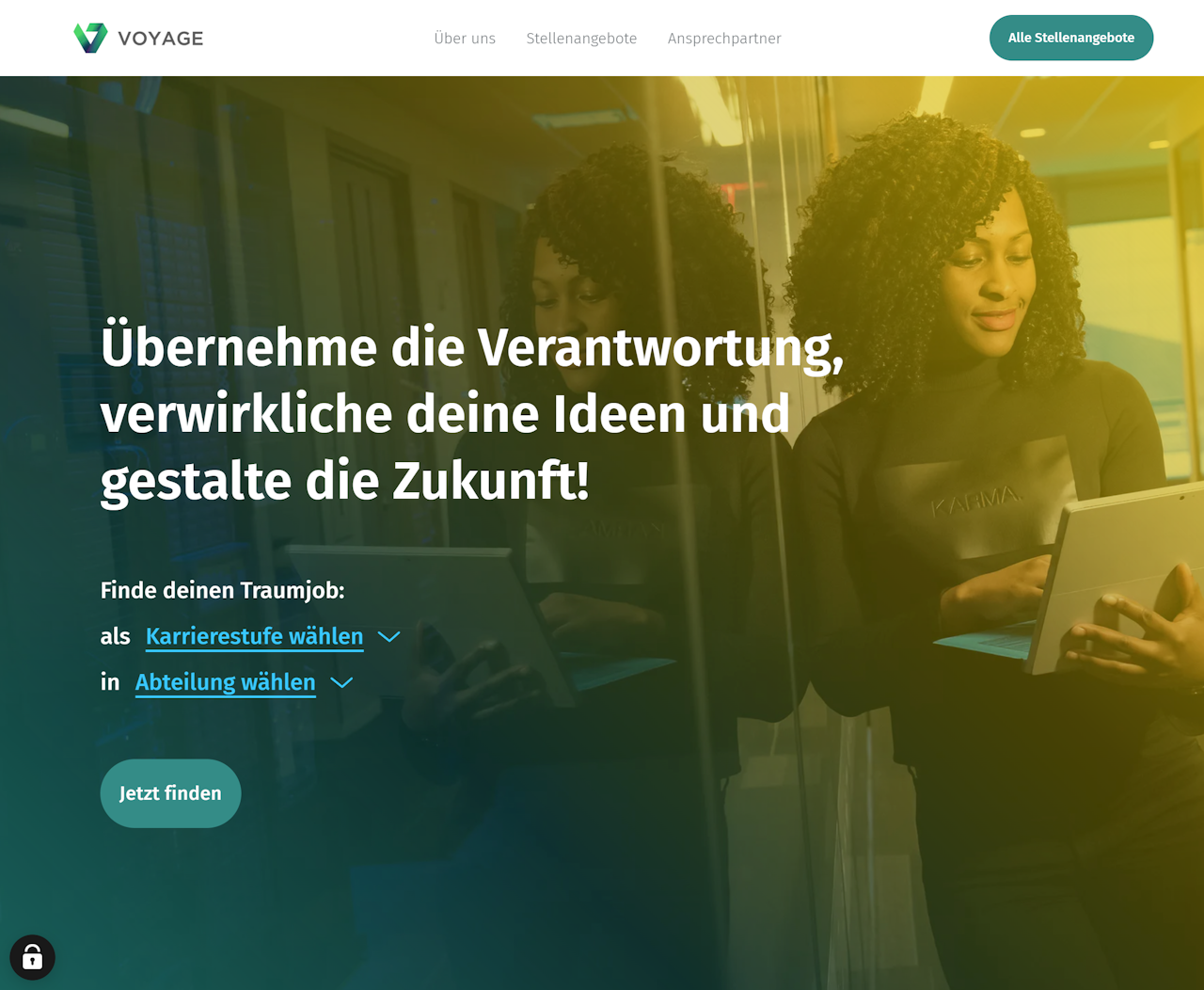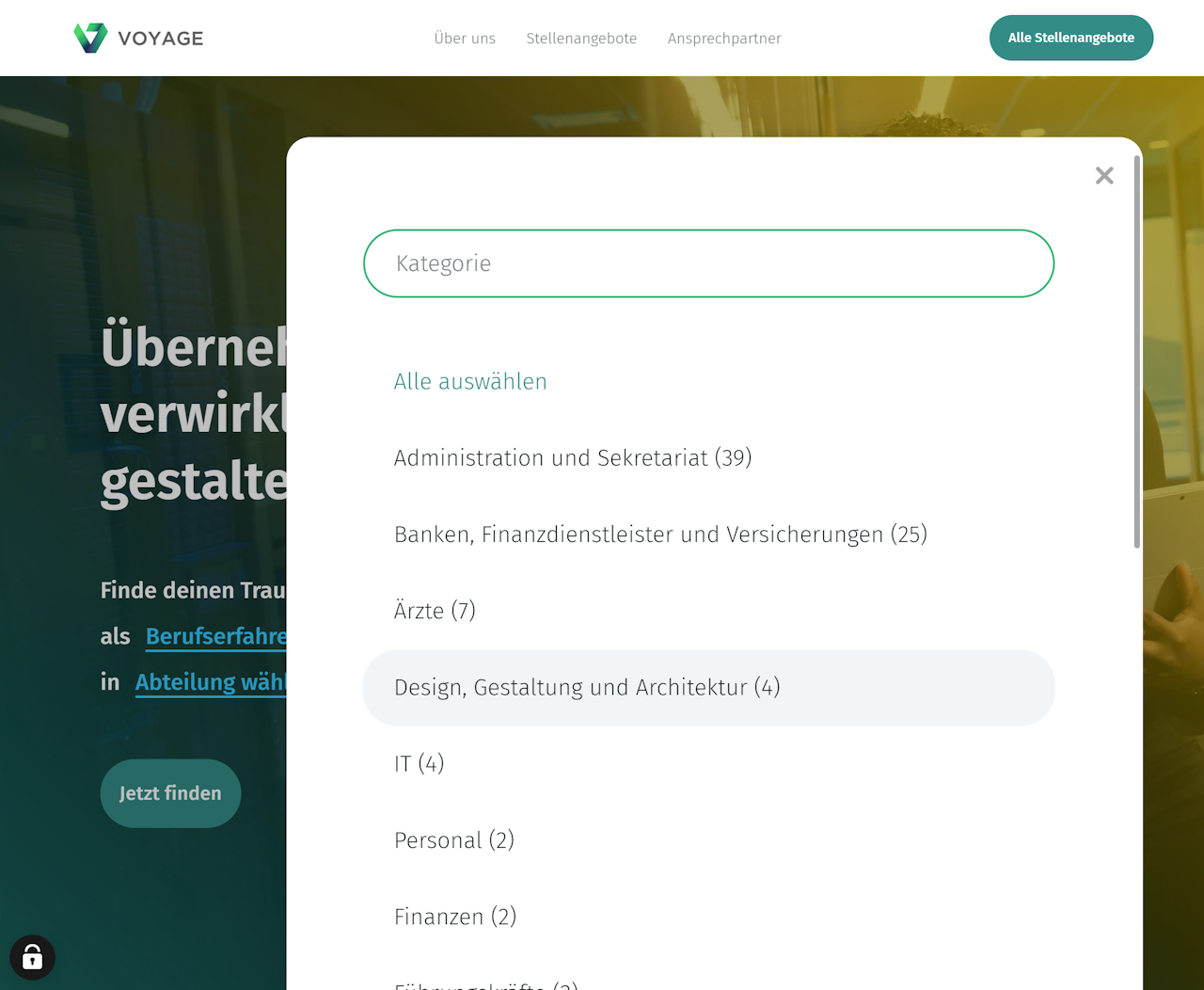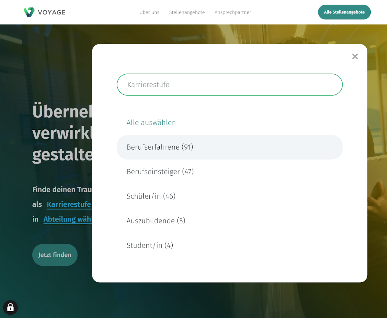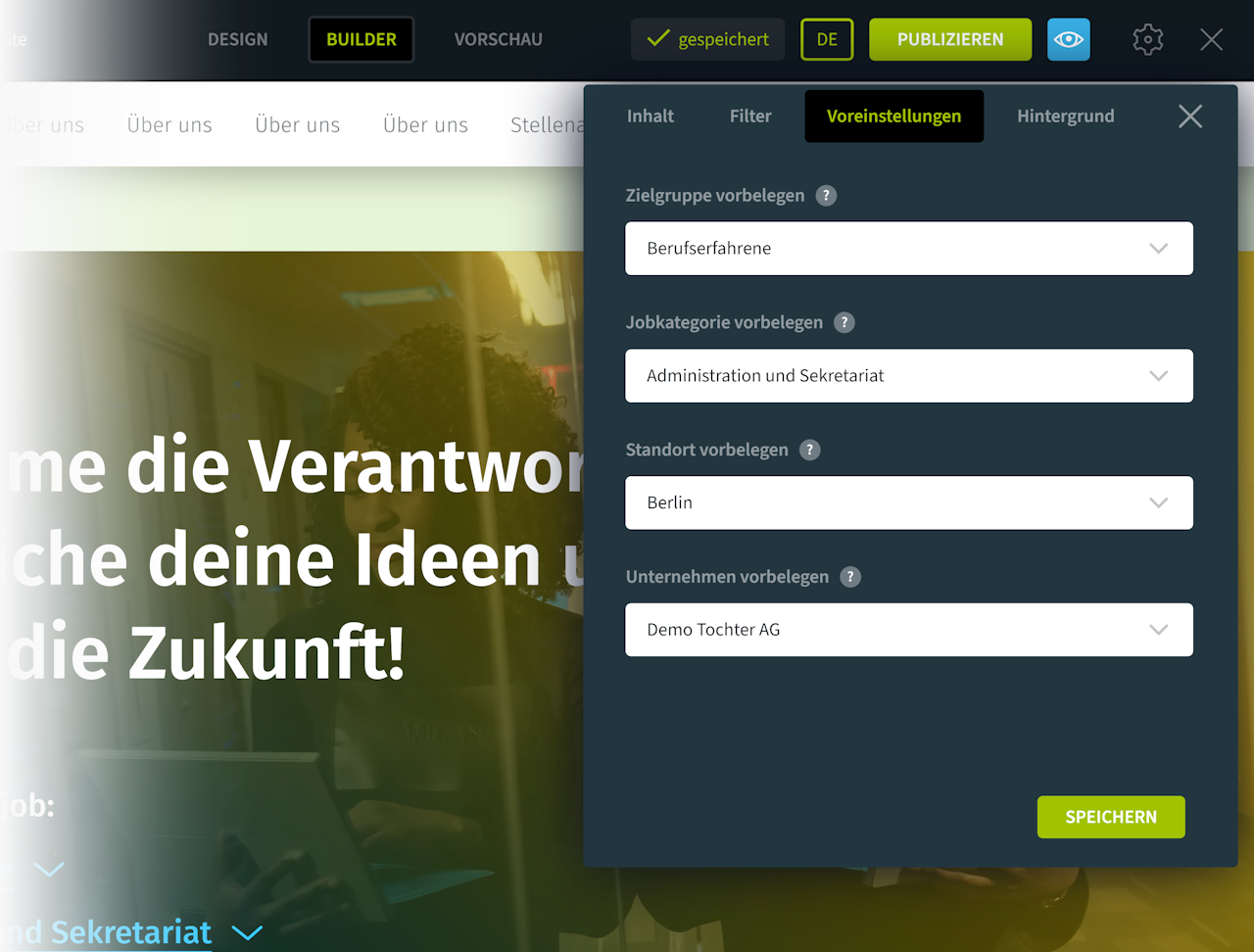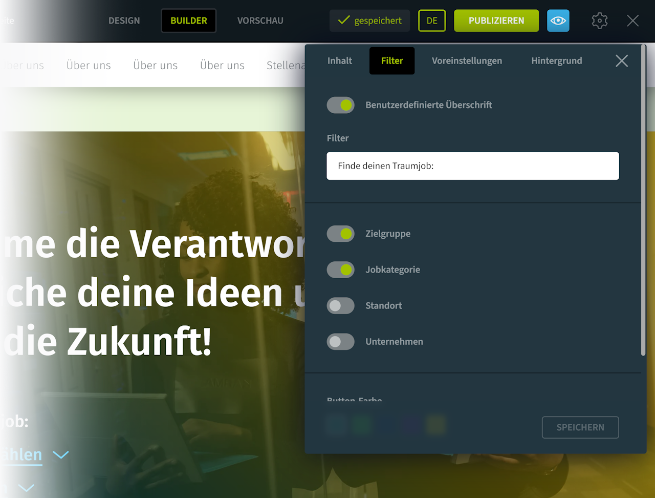 Das Keyvisual mit Filtern eignet sich am besten, wenn Sie viele Stellenangebote ausgeschrieben haben und die Bewerber eine schnelle Auswahl aus vordefinierten Kategorien treffen sollen.