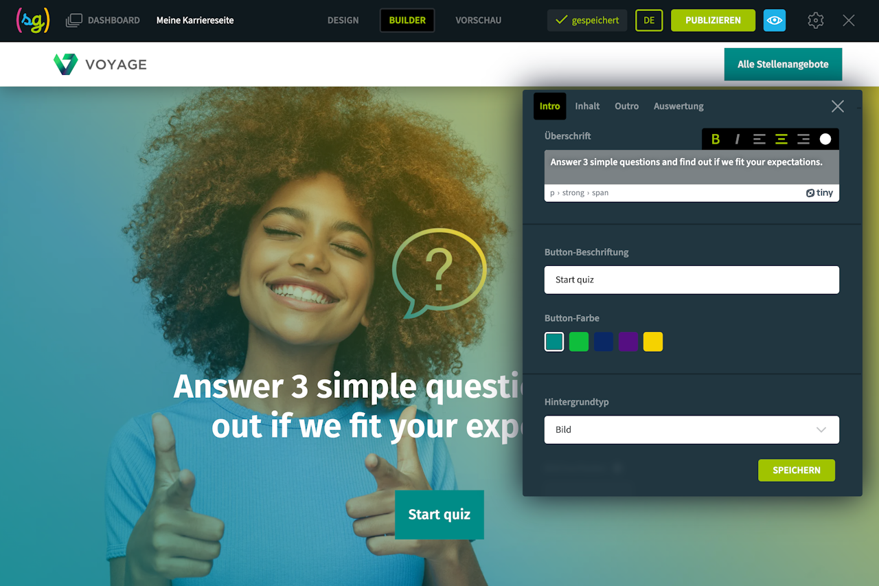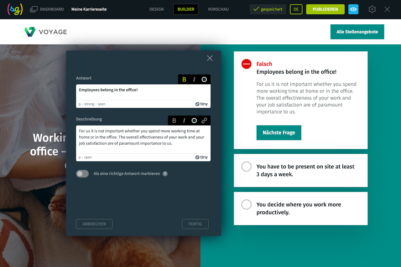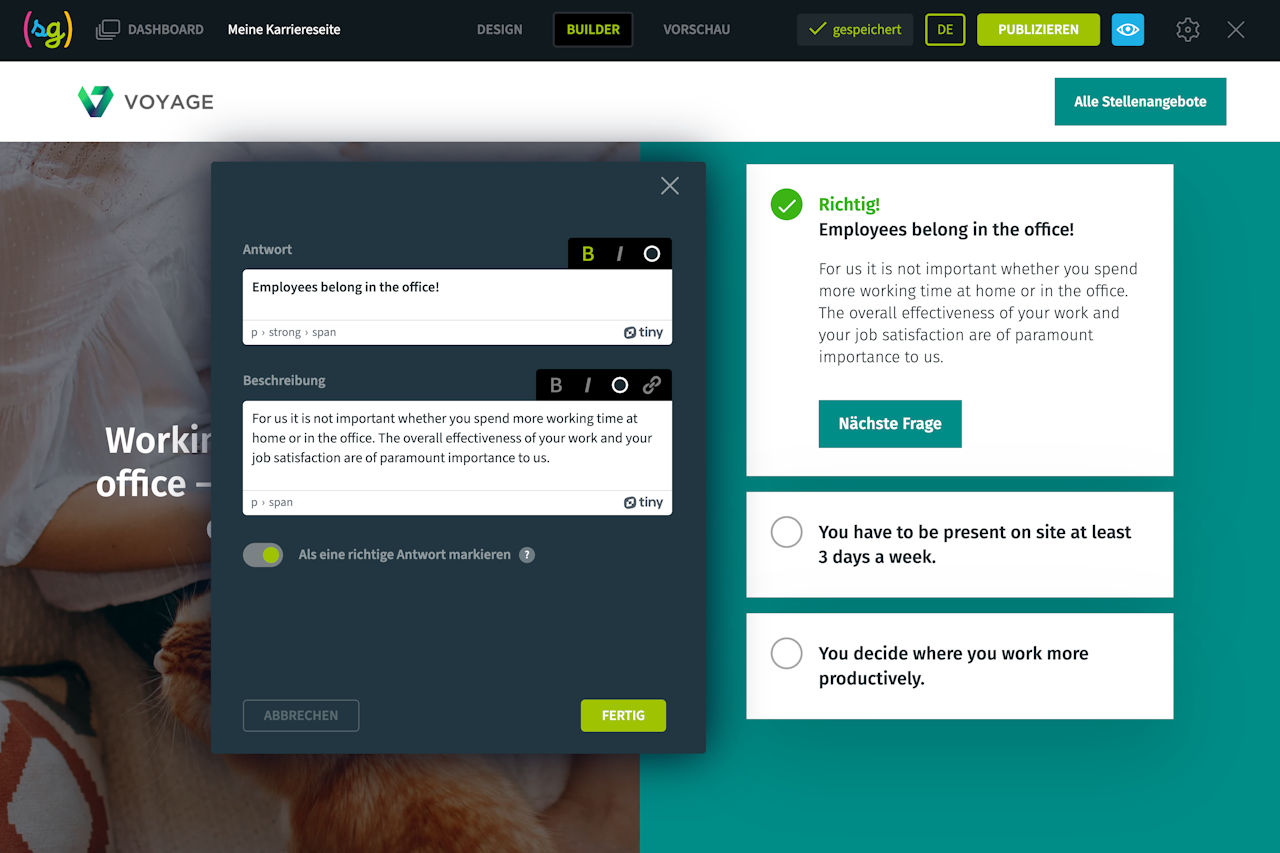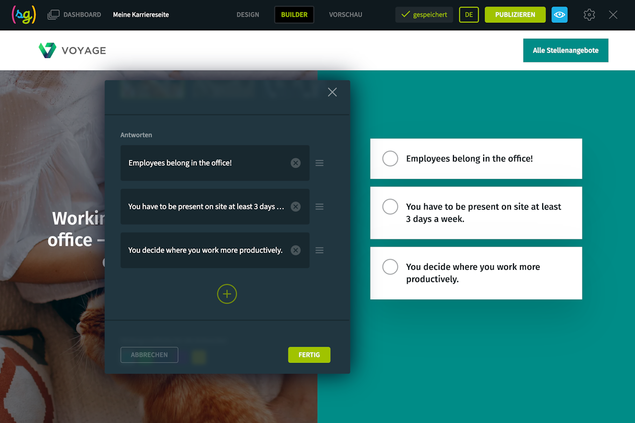 Stellen Sie den Besuchern Ihrer Karriereseite einige Fragen, z. B. zu Ihrer Unternehmenskultur oder -geschichte, und bieten Sie Antworten an, die im Multiple-Choice-Modus ausgewählt werden können.