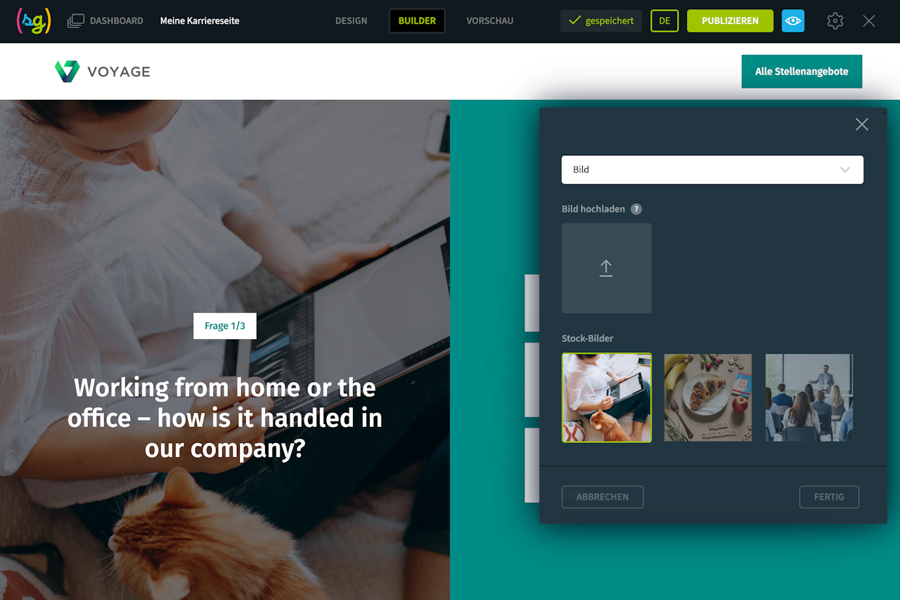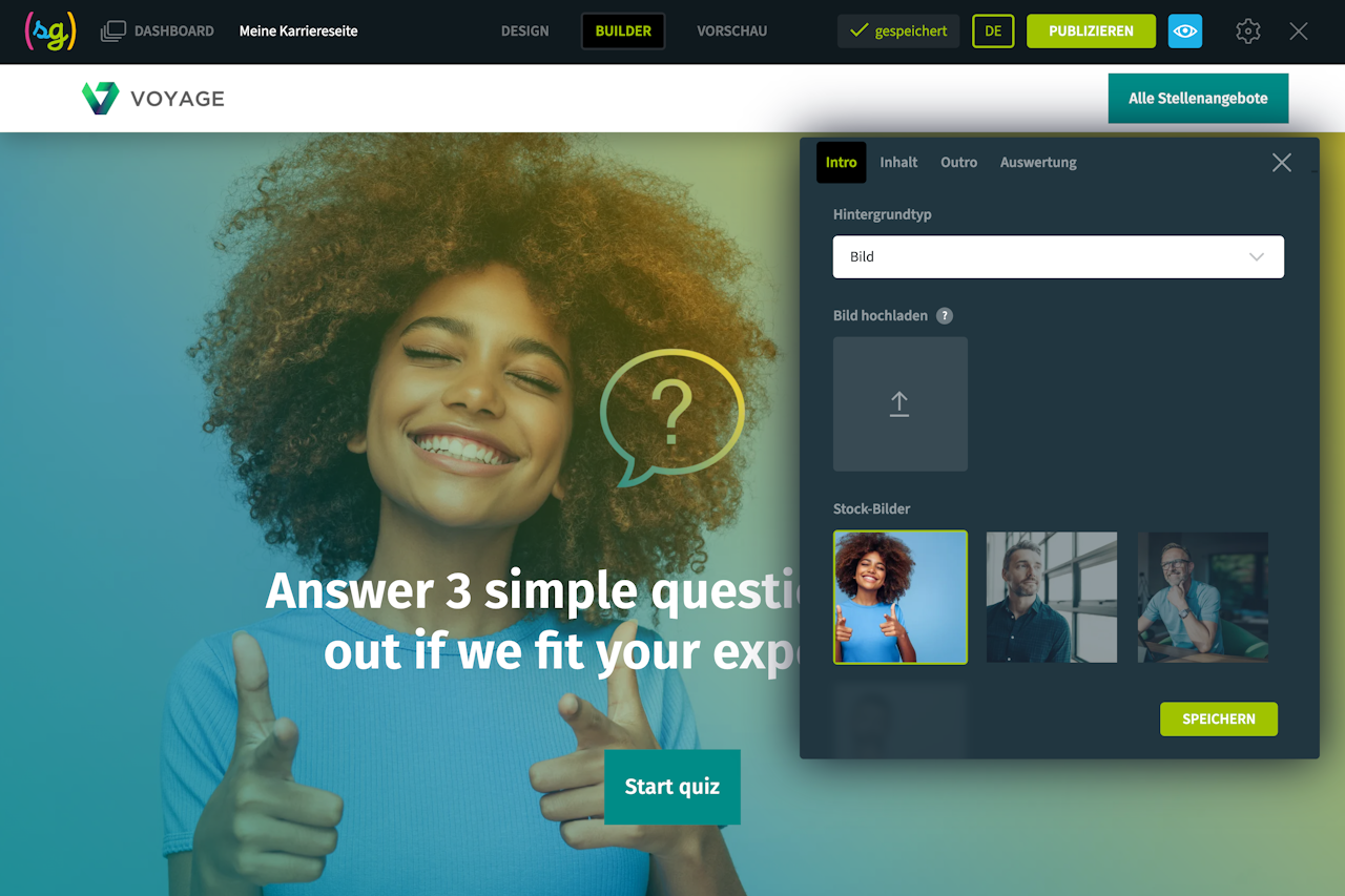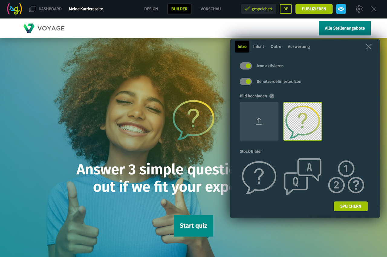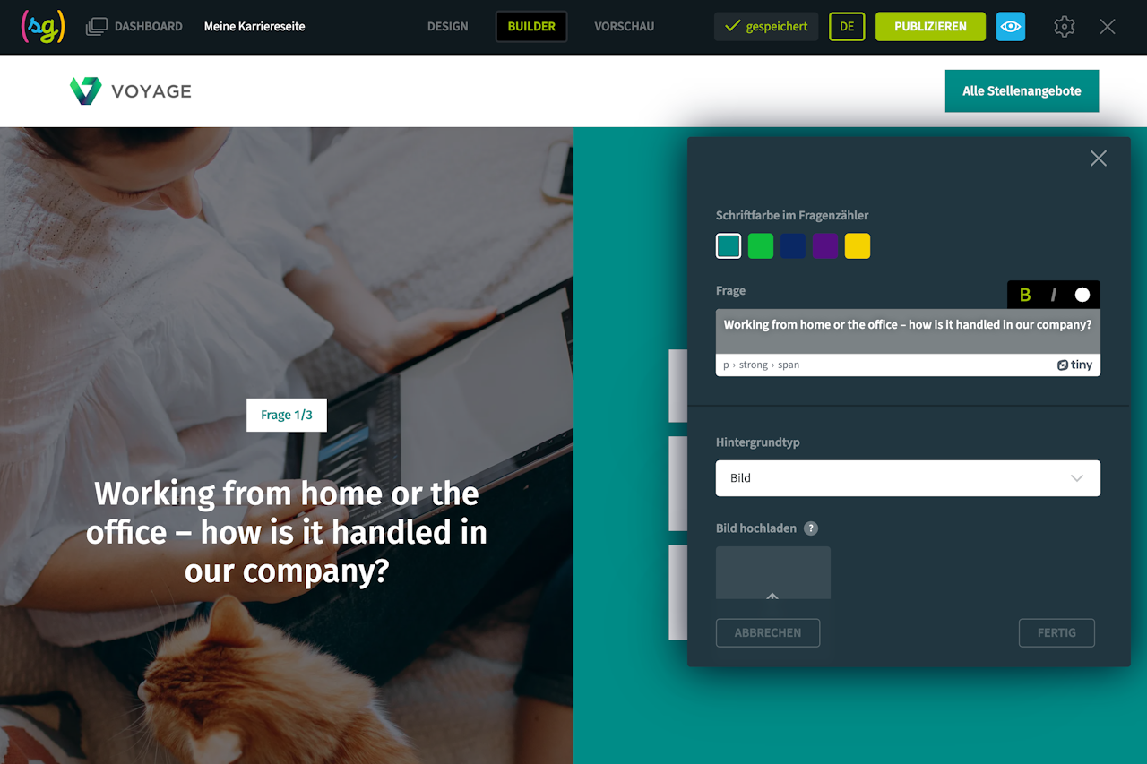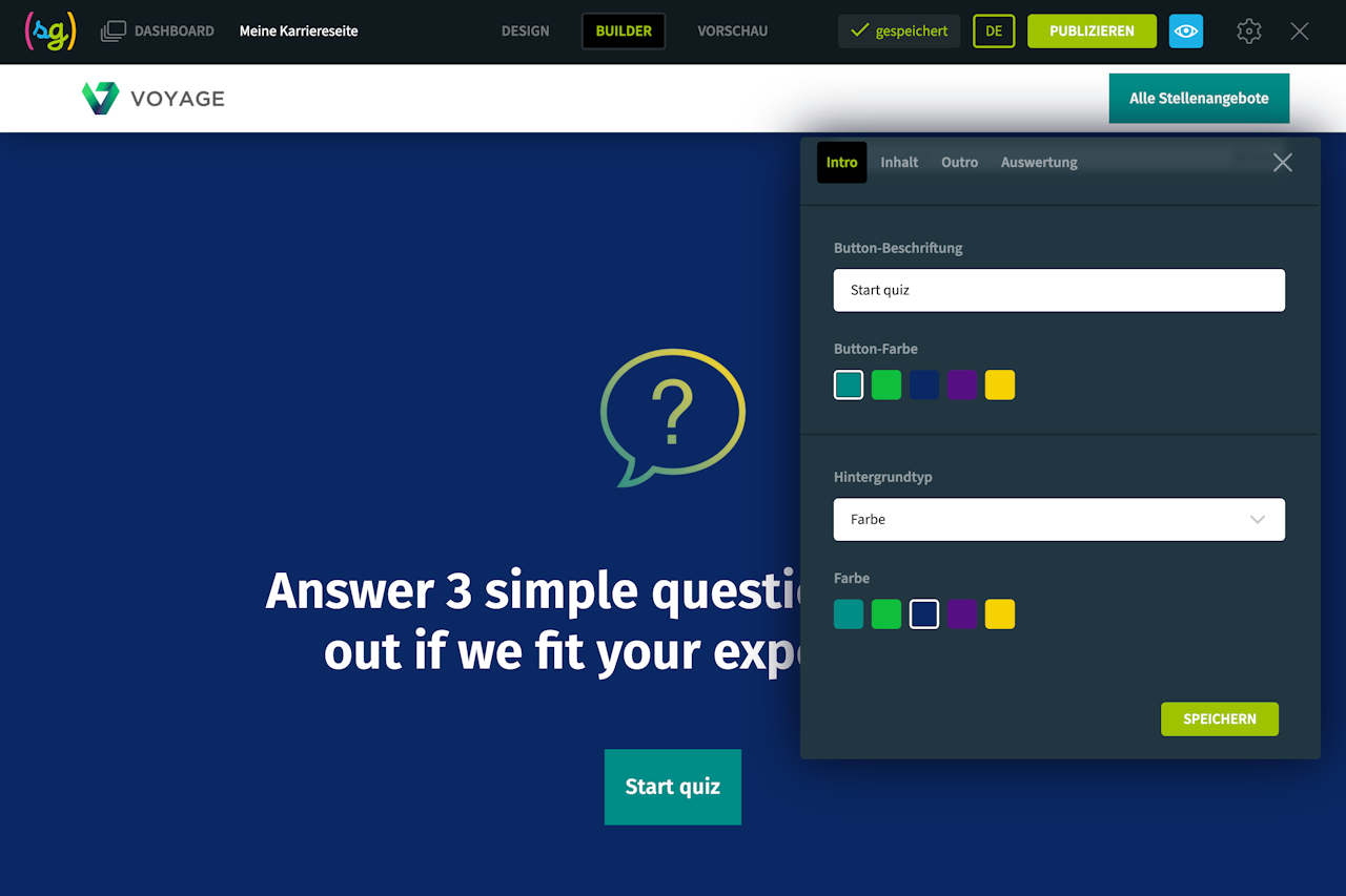 Stellen Sie den Besuchern Ihrer Karriereseite einige Fragen, z. B. zu Ihrer Unternehmenskultur oder -geschichte, und bieten Sie Antworten an, die im Multiple-Choice-Modus ausgewählt werden können.