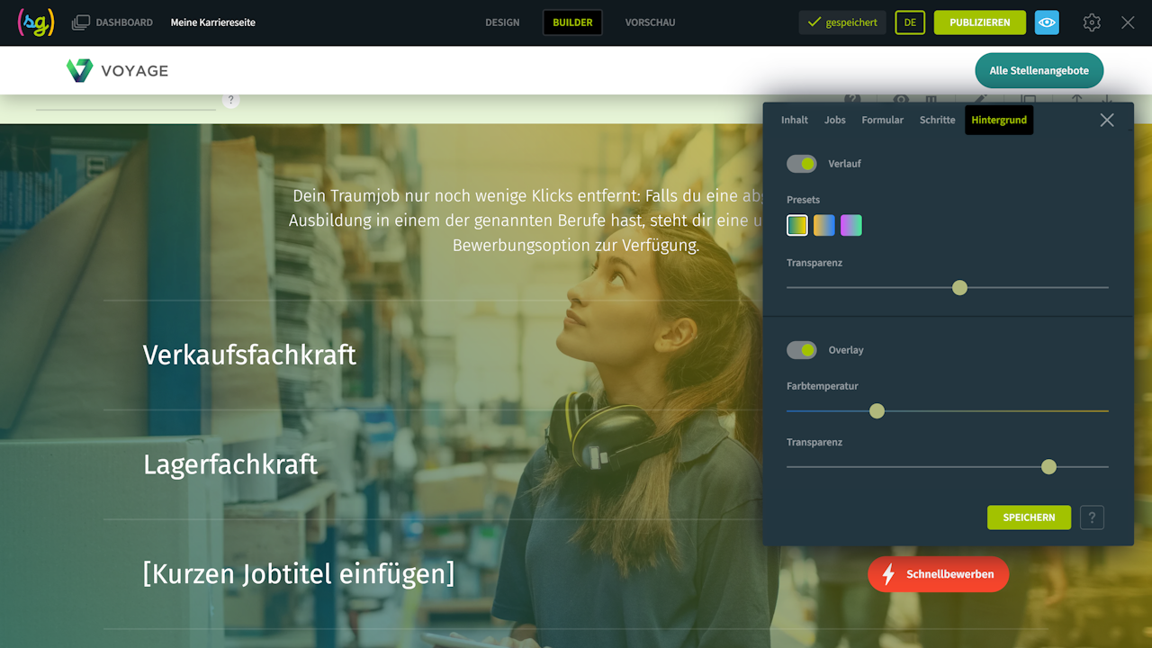 Ein diagonaler Farbverlauf, um dem Hintergrundbild einen visuellen Impuls zu geben. Am besten ist es, hier zwei Unternehmensfarben zu verwenden. Sie können die Transparenz des Farbverlaufs mit einem Schieberegler einstellen.