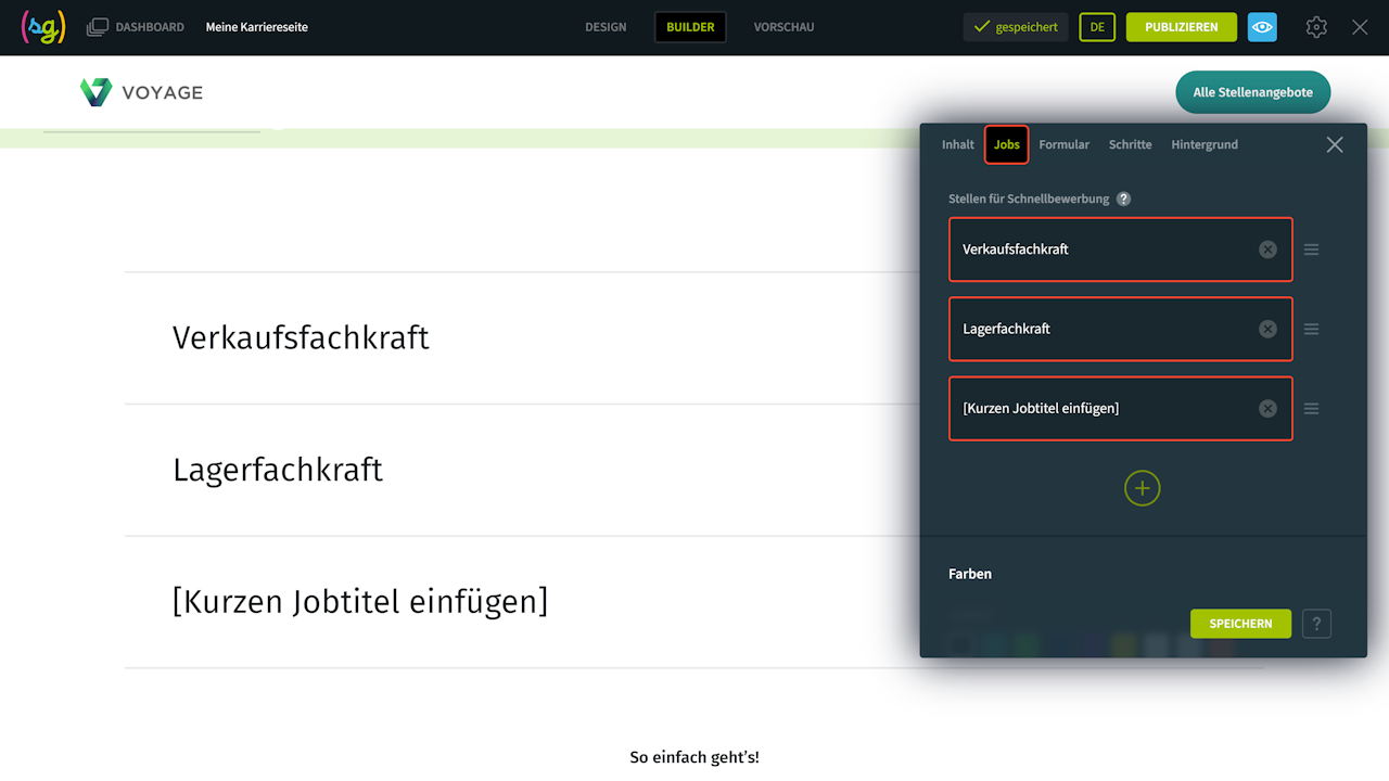 Alle für das Design relevanten Farbeinstellungen sind unterhalb der Jobliste zusammengefasst. Die folgenden Einstellungen sind möglich: