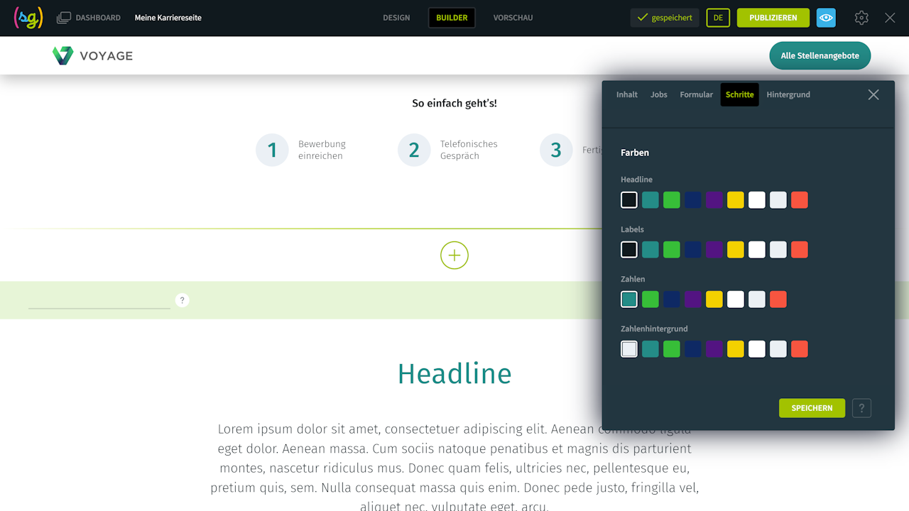 Alle für das Design relevanten Farbeinstellungen sind unterhalb der Schrittliste zusammengefasst. Die folgenden Einstellungen sind möglich: