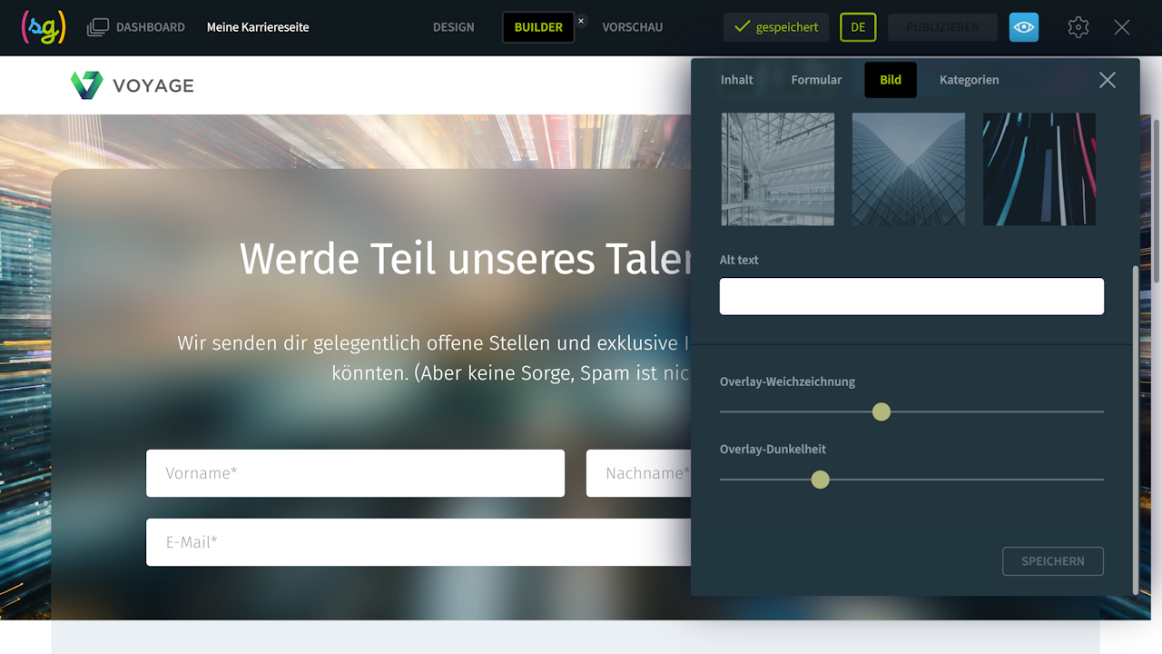 Das Formular wird von einer dunklen, transparenten Fläche unterlegt, um die Lesbarkeit zu erhöhen, ohne den visuellen Eindruck zu beeinträchtigen. Der Grad der Abdunklung und der Unschärfe kann eingestellt werden.