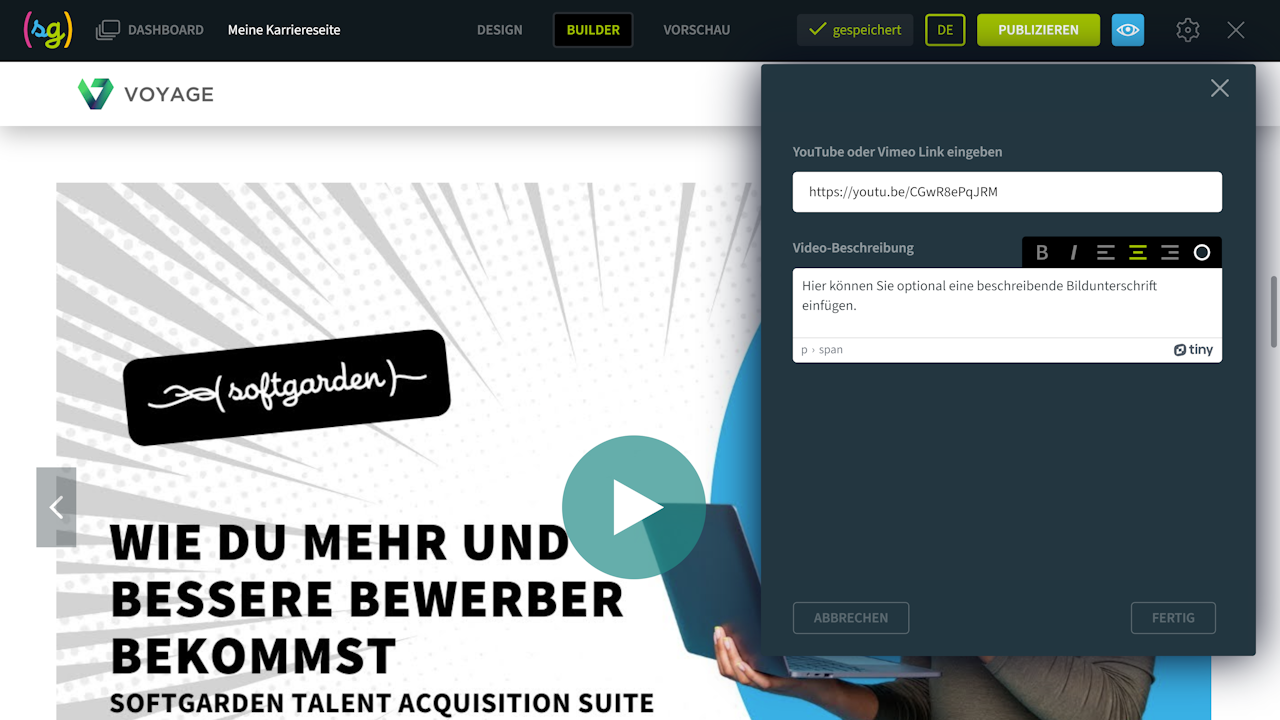 Sie können Videos einbinden, indem Sie entweder einen YouTube- oder einen Vimeo-Link einfügen. Die Links müssen sowohl auf YouTube als auch auf Vimeo über die Teilen-Knopf generiert und dann vollständig in die Komponente kopiert werden.
