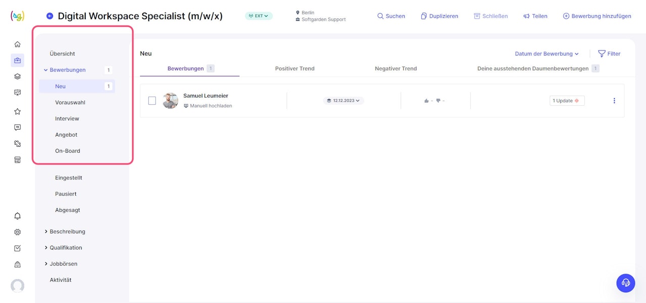 Um neue Bewerbungen zu prüfen, öffnen Sie den gewünschten Kandidaten durch Klicken auf den Bewerbernamen.