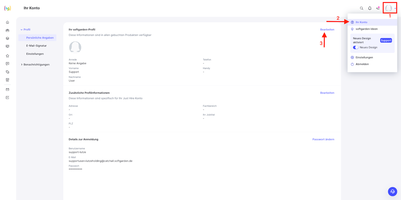Unter „Mein Konto“ können Sie Ihre Account-Daten und Einstellungen wie z. B. Name und Position, Zugangsdaten oder E-Mail-Signatur ansehen oder ändern.