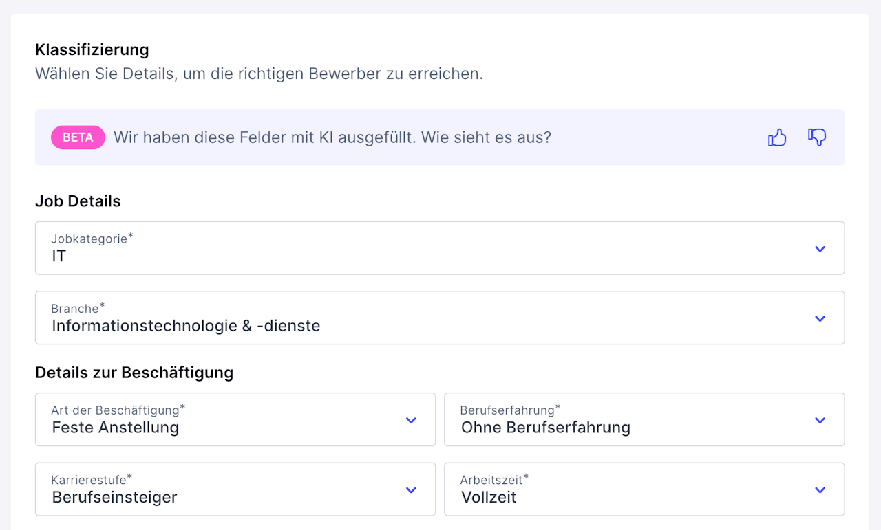 Die Sprache definiert, in welcher Sprache festgelegte Punkte erscheinen sollen. Das betrifft Buttons und Links in der Stellenanzeige sowie die Kommunikation der automatischen Benachrichtigungen, bspw. die Eingangsbestätigung und andere System-Mails zu diesem Job. Die Auswahl kann nachträglich nicht mehr geändert werden!