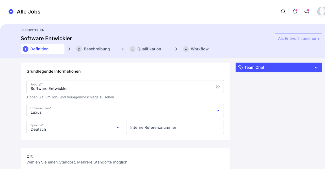 Die Joberstellung kann jederzeit über „abspeichern & schließen“ am unteren Bildschirmrand unterbrochen werden. Der Job wird dabei als Entwurf in der Jobübersicht gespeichert und die Bearbeitung kann an derselben Stelle zu einem anderen Zeitpunkt fortgeführt werden.