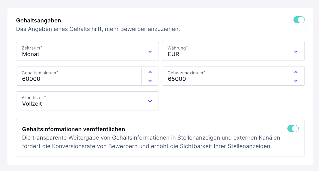 Optional kann die Gehaltsspanne für den Job festgelegt werden. Falls die Veröffentlichung der Gehaltinformationen auf Google for Jobs gewünscht ist, nutzen Sie den Regler für die Aktivierung.