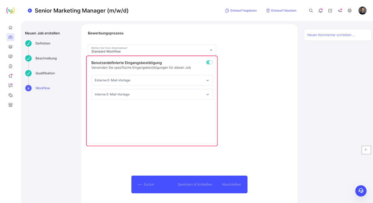 Des Weiteren können Sie hier auch die Auswahl treffen, ob eine benutzerdefinierte Eingangsbestätigung versendet werden soll.