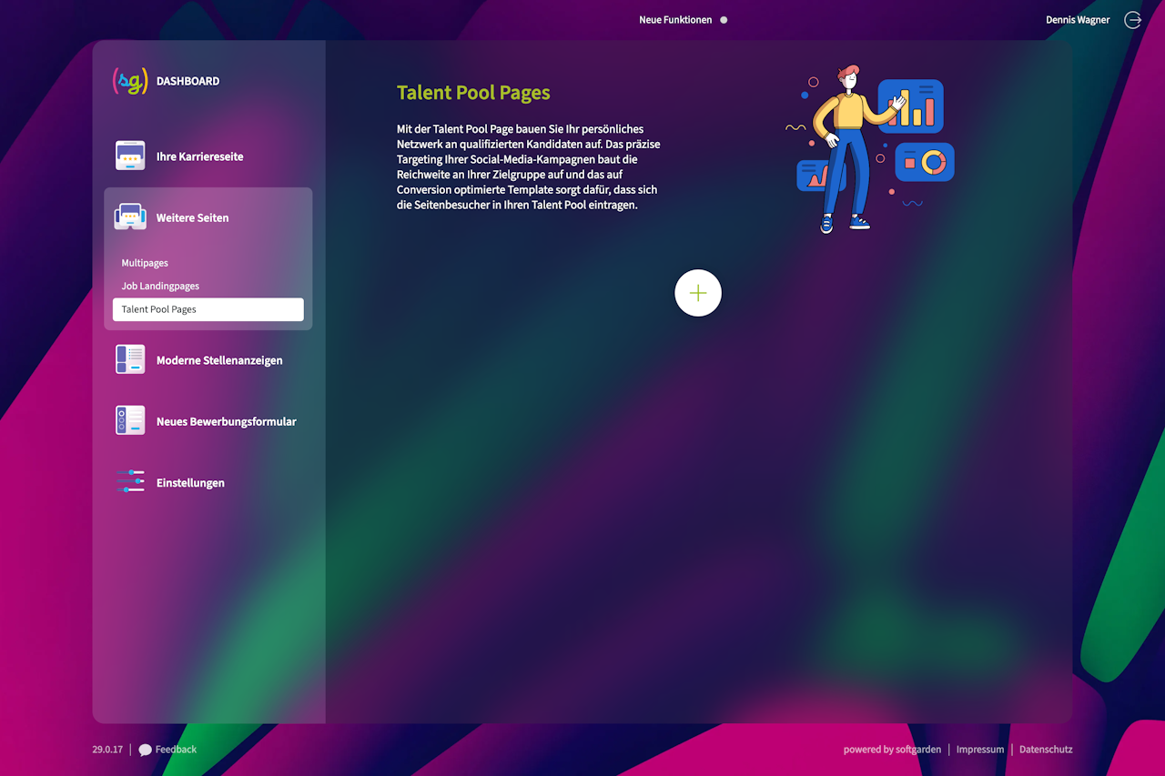 Mit der Talent Pool Page bauen Sie Ihr persönliches Netzwerk an qualifizierten Kandidaten auf. Das präzise Targeting Ihrer Social-Media-Kampagnen baut die Reichweite an Ihrer Zielgruppe auf und das auf Conversion optimierte Template sorgt dafür, dass sich die Seitenbesucher in Ihren Talent Pool eintragen.