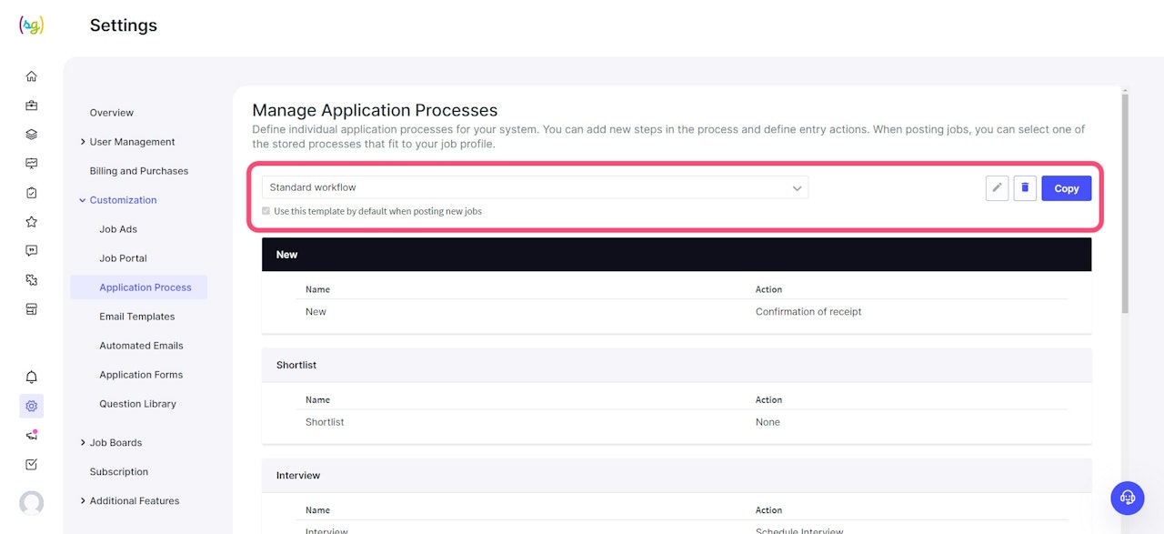 Initially, you have the standard workflow available. However, you can also "Copy" workflows, edit them later, or delete them using the button on the right. Added workflows can be accessed via the drop-down list and defined as the standard. Additionally, when creating a job, you then have the option to select the respective workflow for each position.
