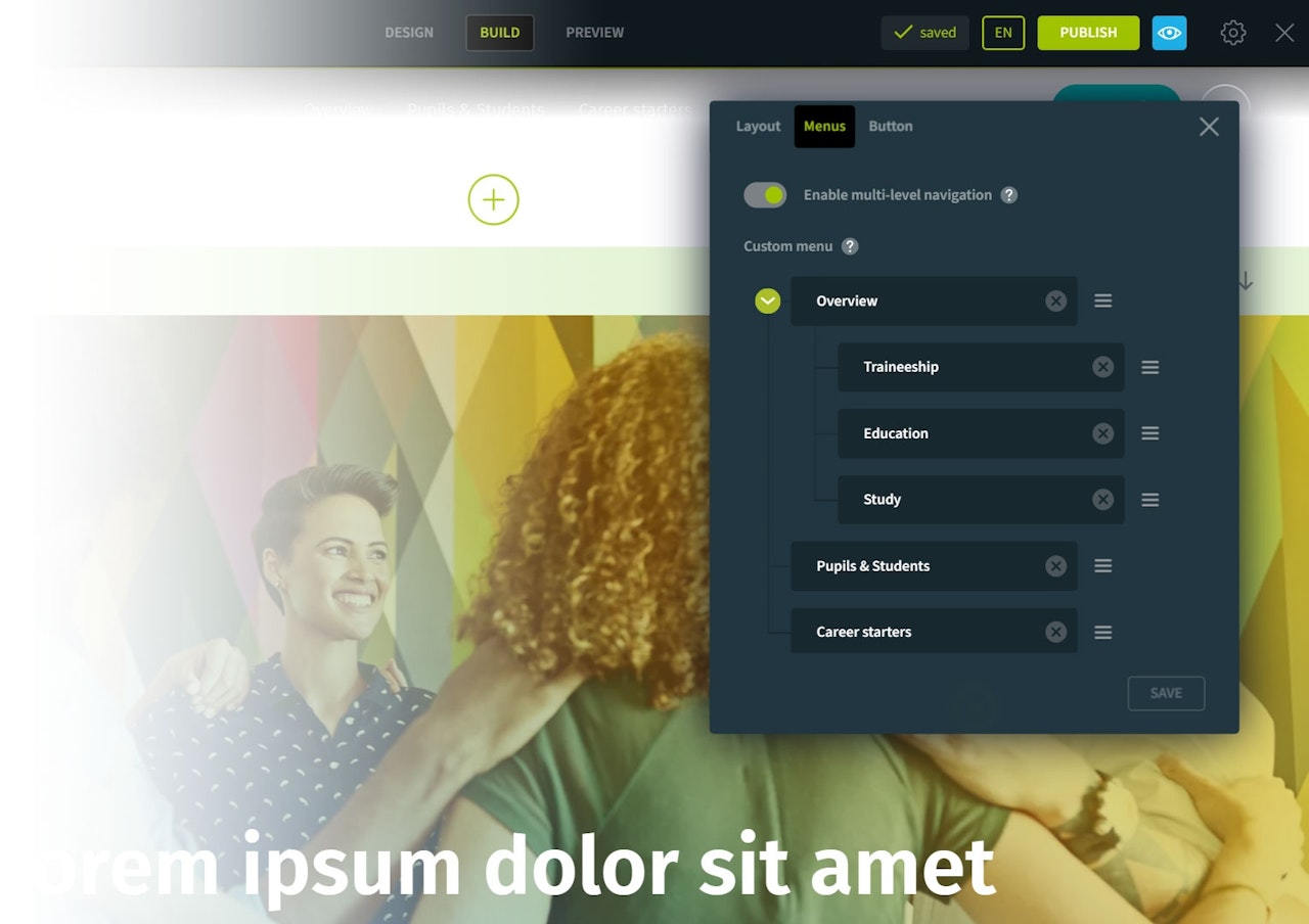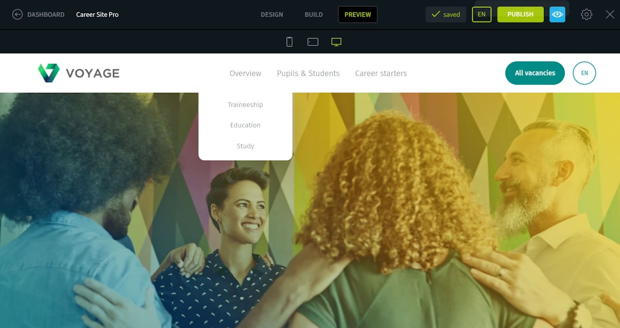 This is how it will look on your career page: visitors can hover over the navigation points to expand the sub-navigation.