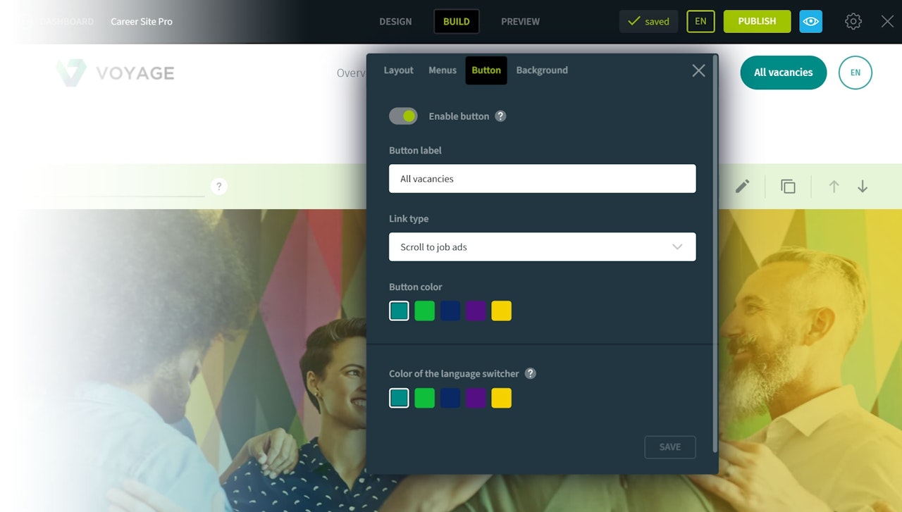 The call-to-action button on the right side of the navigation offers your website visitors the opportunity to quickly jump to the job listings. We recommend keeping this feature as it provides the best user experience.