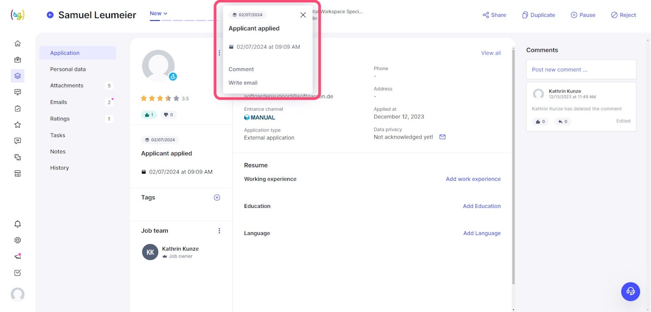 By clicking on the application date in the taskbar above, you can use the function "Compose Email" to contact applicants, for example, to request documents. This email is not tied to any workflow step and is continuously available, unlike the status-bound templates.