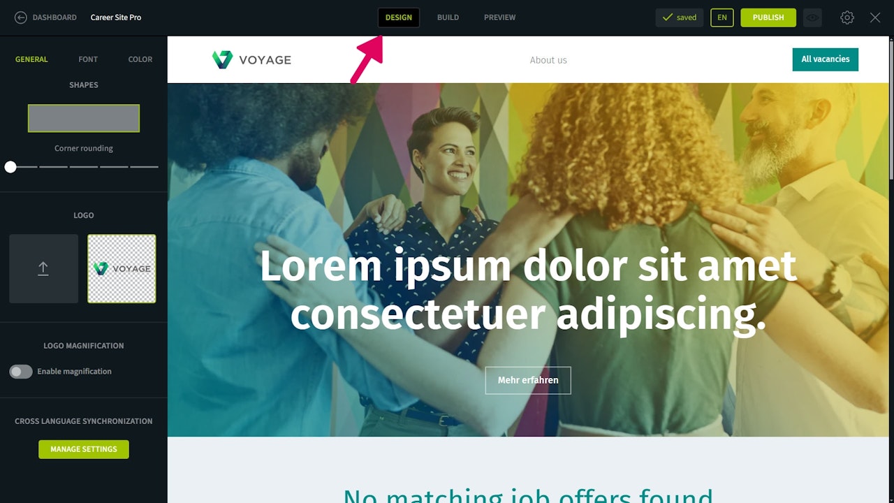Your career page can be easily adapted to your corporate design with just a few clicks. To do this, go to the “Design” tab and make the following adjustments: